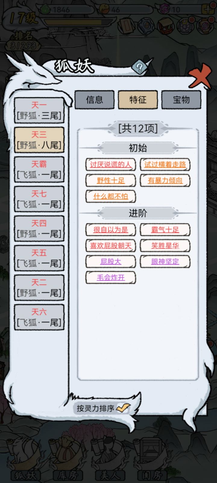 天赋高的狐狸 初始个性和灵力会比较高【个性】影响法宝效果【灵力】升级、穿法宝可以提升【强化】提升突破概率【游历】游历找到的宝物会先自动穿到找到它的狐狸身上,除非已经装备了一件才会入库。🧐游历建议:按个性排序自动选择狐狸【闺房】闺房家具……不要先急着升级,先把所有家具全买了,往右拖有其他位置添置家具。等玉多了直接把灵力家具拉满【灵力要求】狐妖灵力14w左右化形必出一等绝色美人灵力