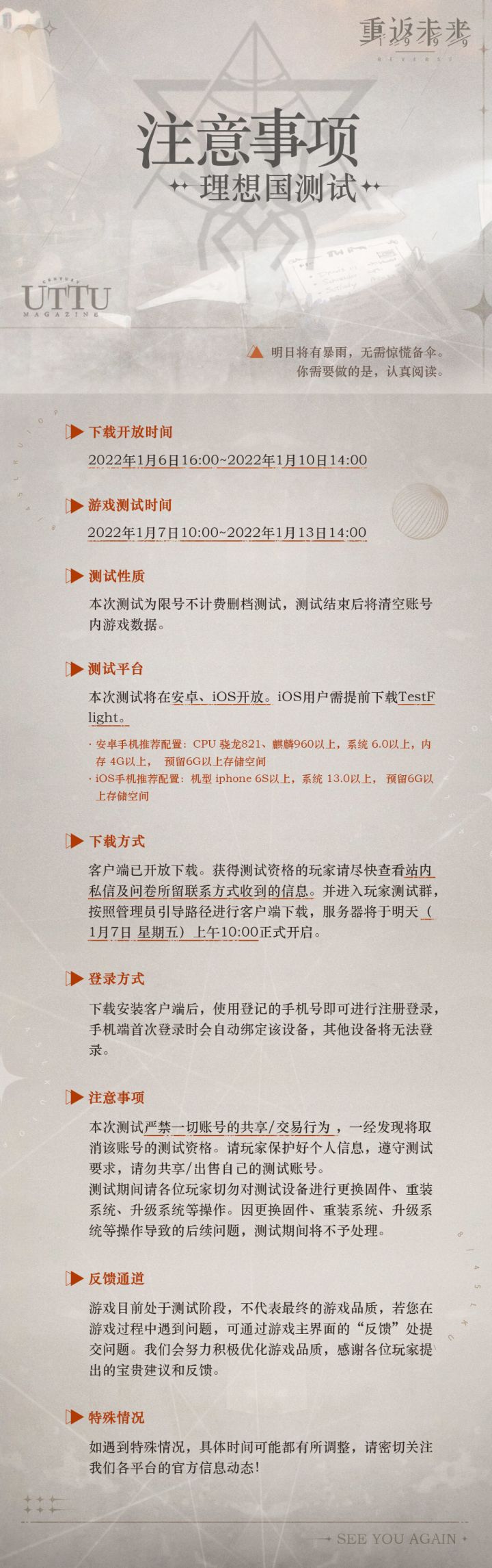【理想国测试】即将开启!理想国测试现已开放下载,请获得首测资格的玩家及时完成游戏预下载。★预下载时间:2022年1月6日16:00~2022年1月10日14:00★预下载方式:1)已加入首测玩家群的玩家,请根据群公告引导获取下载链接。2)还未加入首测玩家群的玩家,请按照短信或官方账号回复引导,加入首测玩家群获取下载链接。注:本次官方测试资格发放的电话号为189****8991,请勿相