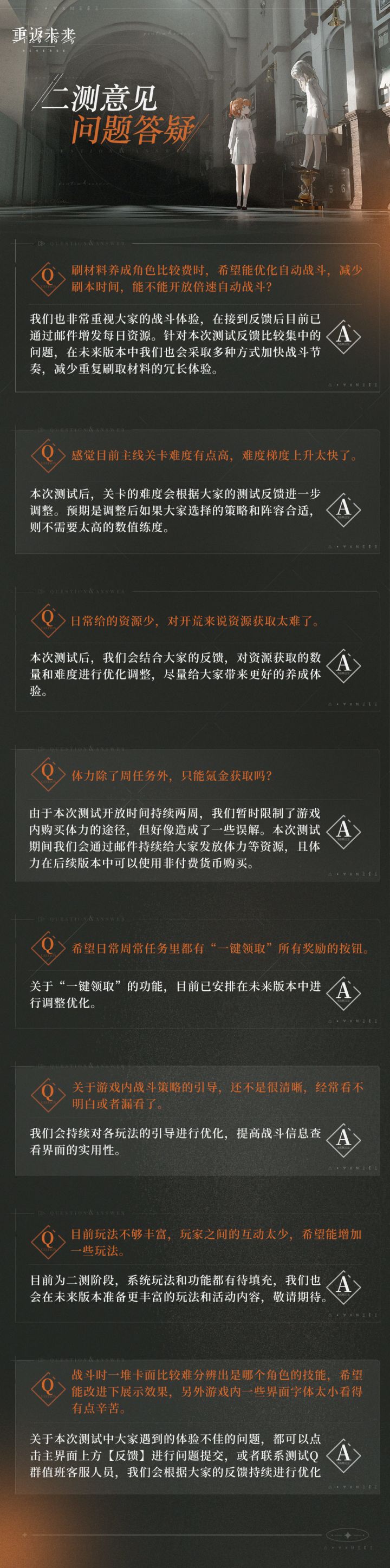 距离【边缘史测试】开启已有一段时日,期间制作组收到了各位提出的许多游戏疑问和宝贵建议。针对目前比较集中的问题和反馈,我们将会在《重返未来:1999》的未来版本中持续优化调整,为大家提供更舒适的游戏体验!详情请查看下方长图。★了解更多★官方微博:重返未来1999官方公众号:重返未来1999官方玩家群:8群 747475940★前往预约★TapTap预约:官网预约: