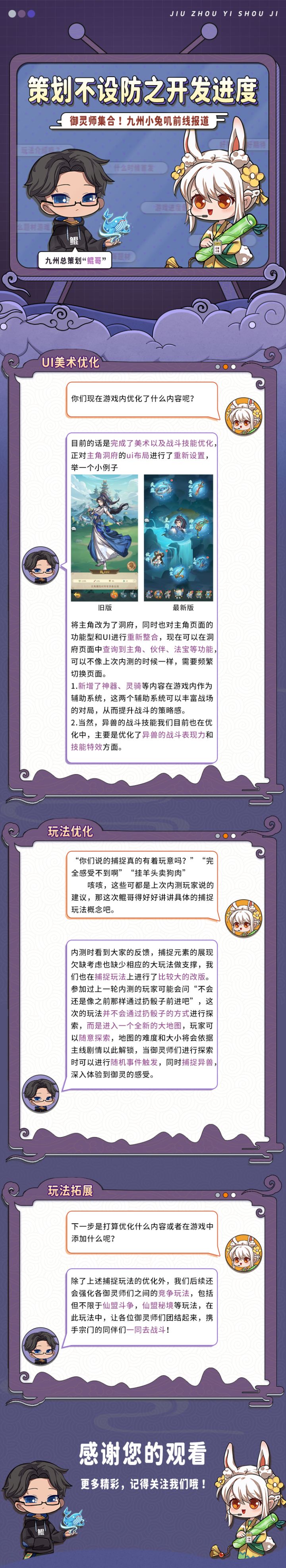 “游戏没有亮点”“宣传的捕捉玩法一个也没看见”“玩法单一,枯燥”在第一次内测至今,兔叽收到了非常多的吐槽和建议。对于这些吐槽和建议,开发组们全都进行了认真考虑,并对游戏各方面都进行了优化改动,希望可以更符合御灵师大大们对游戏的期待~接下来,就由兔叽带领御灵师大大们看看会有什么改动吧!--------关注我们的官方公众号【九州异兽记】超多福利礼包和攻略资讯等你来拿!
