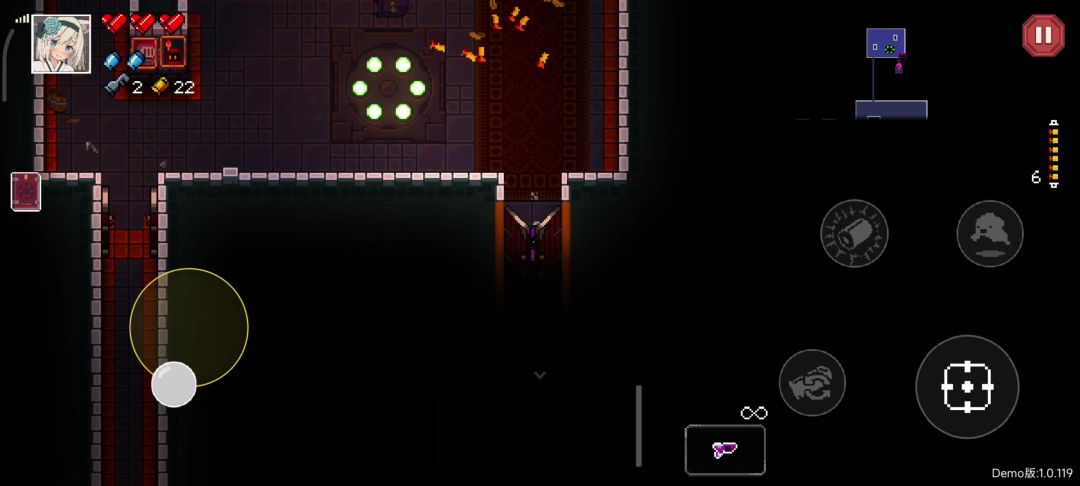 射击,手游应该自带一定范围内瞄准。有射击精准这一属性,绝大部分枪械子弹都自带一定的偏移,部分被动道具会影响这个属性。点名批评飞行员的初始手枪。 空弹,击退附近敌人,造成少量伤害,消除全屏子弹,破坏隐藏房墙壁。护甲(也就是一次性血量)被打破时有相同效果,每当进去新的一层时不足两个会补充到两个。 掀桌,其实不是很常用,因为桌子不是到处都有,只有一个主动道具可以随身携带桌子。掀桌时消除桌子周围子弹,掀起