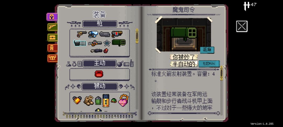 射击,手游应该自带一定范围内瞄准。有射击精准这一属性,绝大部分枪械子弹都自带一定的偏移,部分被动道具会影响这个属性。点名批评飞行员的初始手枪。 空弹,击退附近敌人,造成少量伤害,消除全屏子弹,破坏隐藏房墙壁。护甲(也就是一次性血量)被打破时有相同效果,每当进去新的一层时不足两个会补充到两个。 掀桌,其实不是很常用,因为桌子不是到处都有,只有一个主动道具可以随身携带桌子。掀桌时消除桌子周围子弹,掀起