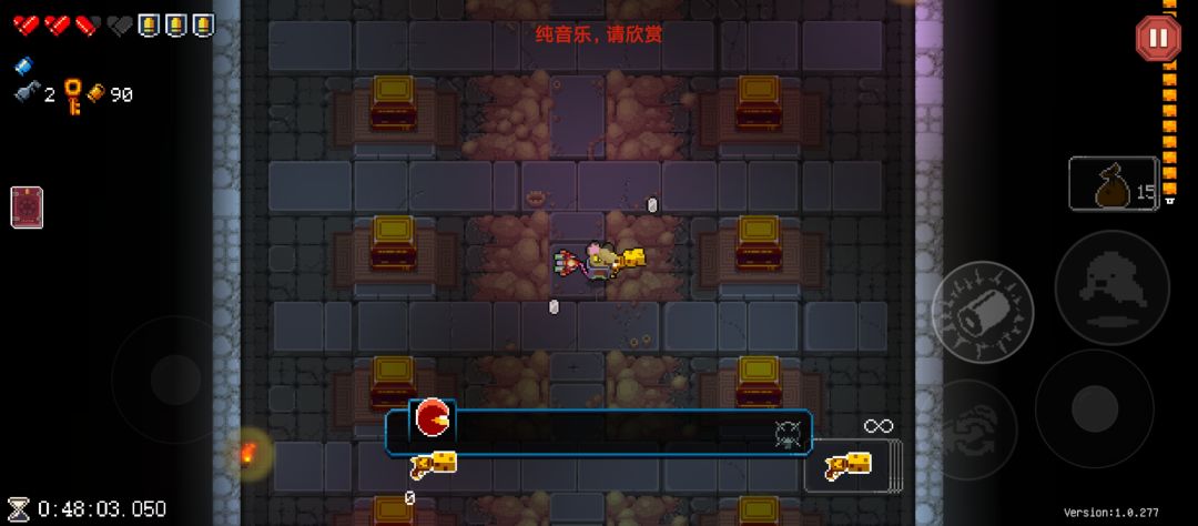 普通层不要大退,隐藏层可以无限大退,在隐藏层打开宝箱后清理完一个房间后大退可以在这一局游戏保留该道具,但是有时候宝箱的内容是固定的(触发条件不清楚)。这时候运气好可以一直拿到强力的被动道具,图4是我拿到8个a子弹(弹夹第一发攻击伤害➕100%)