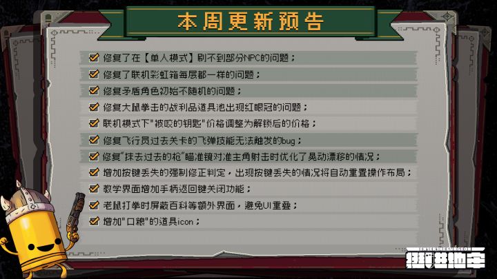 各位枪友们!昨天我们推送了对单机模式下NPC随机性修复的更新,看到大家基本能够正常推进游戏剧情,我们也就放心了。接下来的计划是对联机模式的随机性问题进行校对,以及大家提到比较多的一些容易“失控”的特别道具的操作调整。这部分调整会在下周的更新中陆续与大家见面。9月19日更新:修复垃圾宝宝和主动道具只能触发一次在今天的更新里面,我们修复了部分问题,其他的一些问题,以及此次解决不是很彻底的情况,
