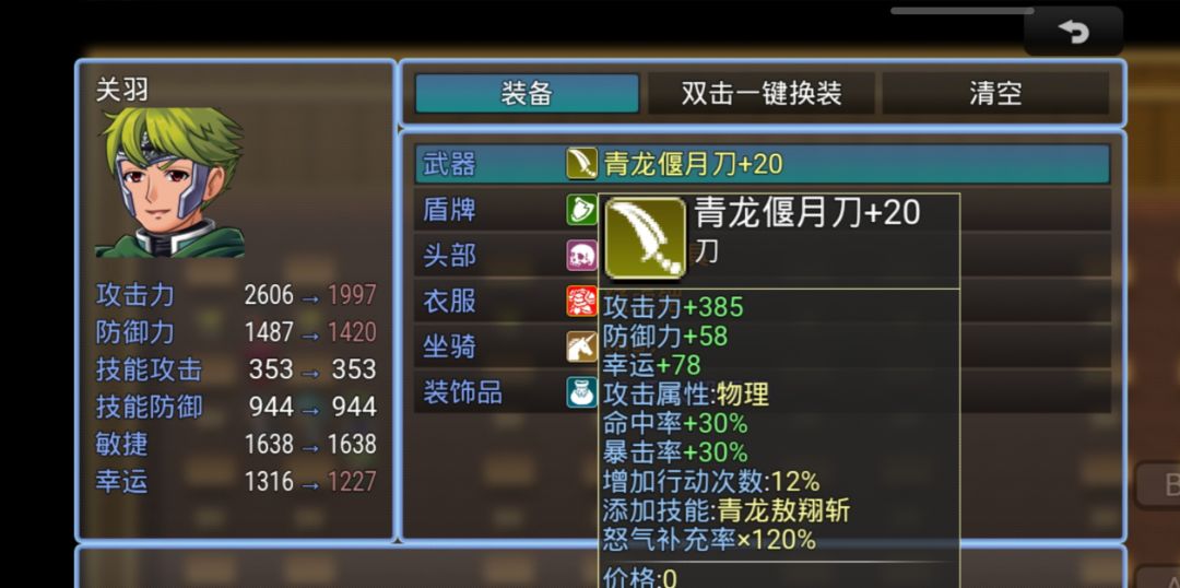 关羽的崛起(随机点杀物理系第一) 版本变更473,做一定修改。 评价:伤害爆表自身硬硬硬!不错的在动甚至于三动。在某些高难度战役中有非常强势的表现。想刀刀暴击嘛? 最强武器:青龙偃月刀,初次打完蛟龙升级后,附带技能随机单点3次。 强化加10:随机单点6次。 强化加20:随机单点9次。暴击高达30点。 装备推荐,吕布套,猛虎套,青龙偃月刀强化加20。 马推荐:绝影再动10,嘶风赤兔再动15。 饰品:挂机四嘟嘟印,难度战:吕布套装饰品,吴玉玺。 职业:可以专职突击吃属性,打雪林狼吃属性后,南中专职小霸王,也可以不转突击直接专职小霸王,吃的果子稍微多点。 暴击数值:自身33暴击,武器加20后30点暴击,小霸王职业25点暴击,综合暴击:88点。 最终总结: 高额的暴击多段的伤害,高额的2之3次再动,自身硬度超标,伤害拉满。目前老鸟模式物理系第一无可争议。 难度战,面对老鸟曹操孙坚这种超高反击的BOSS也可以凭借自身高超的硬度,高额的攻击次数和多动率,以及暴击率打出你想要的伤害。并且保证自身的安全性。 缺点:在没有赤兔转职突击,雪林打狼加属性的情况下,养成的过程需要耐心。武器强化过程艰辛,吕布套刷的辛苦。 有些图没有,有图了会上传。