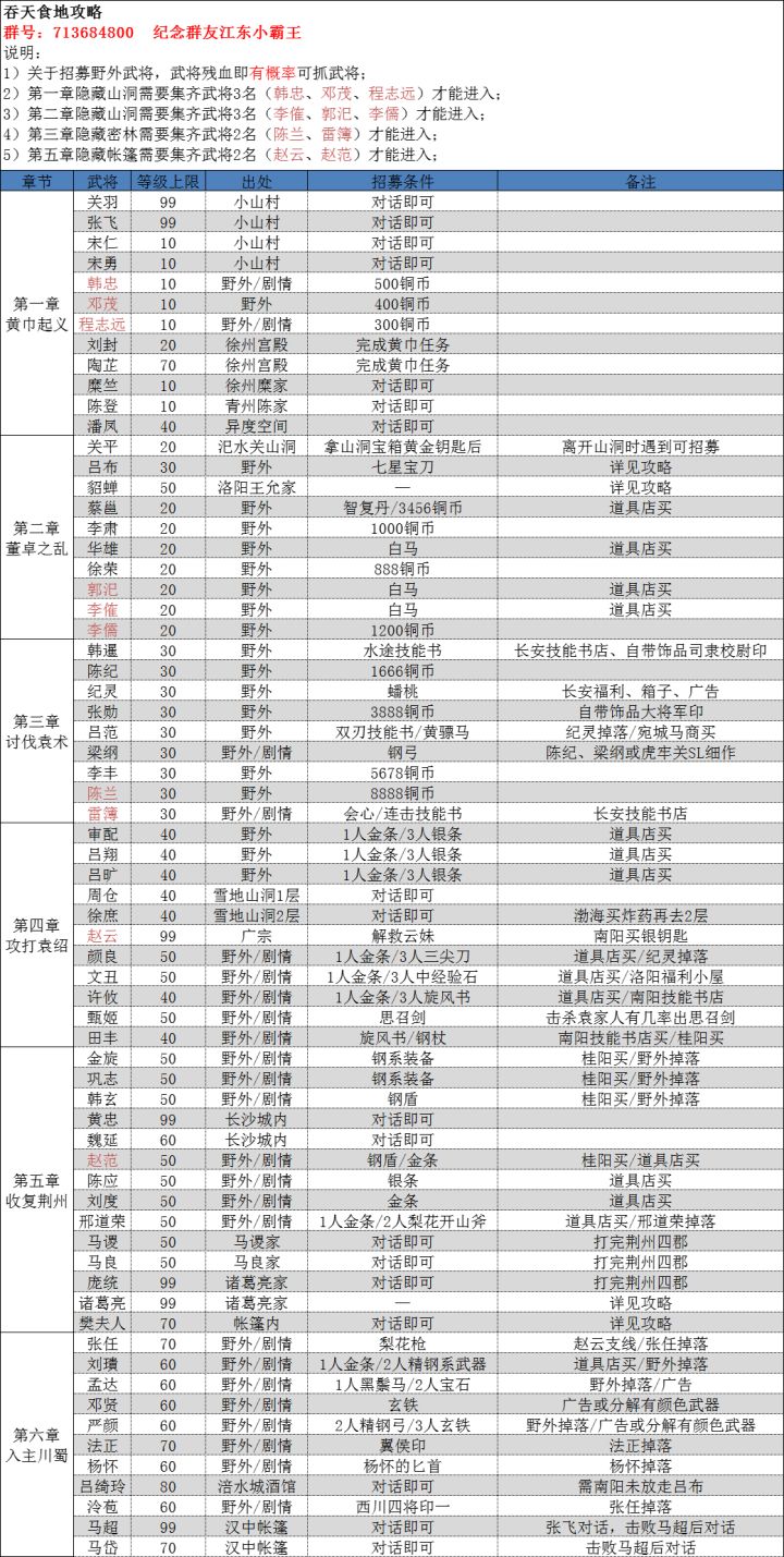 第一章:黄巾起义1、宋仁/宋勇:新手村门口2、糜竺:徐州糜府3、陈登:青州州牧府右边房子对话4、韩忠/邓茂/程远志:需要银子,韩忠去青州山洞比较好抓5、刘封:打赢张角后刘备对话陶谦领徐州牧后代替他出战第二章:诸侯讨董1、郭汜/李肃/徐荣/李儒:银子2、华雄/李傕:白马3、蔡邕:智复丹,商店有卖4、关平:汜水关和虎牢关中间山洞,拿到宝箱后在门口蹲着5、吕布:七星刀,然后野外抓6