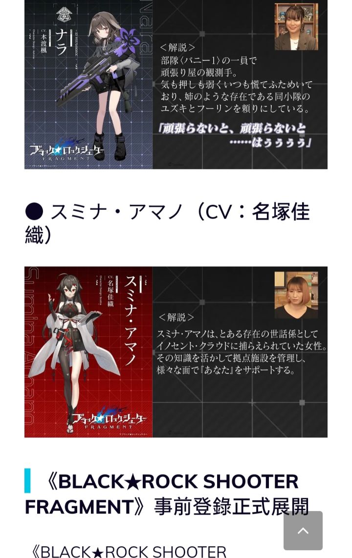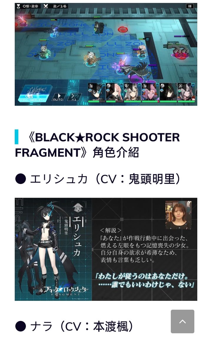 在宣布推出新动画后,新手游企划《黑岩射手FRAGMENT》(ブラック★ロックシューター FRAGMENT)也正式公布,将在2022年秋上线。突然开始的世界的终结。你所寻求的是灭绝,还是生存?手游的故事发生在与TV动画不同的另一个世界,22世纪中期,网络上突然出现的「情报生命体」突然对人类宣战,人类开始将未高度电子化、不会感染病毒的「合成物」作为士兵开始反击,作为指挥官的你,与和巨大的机械一起出