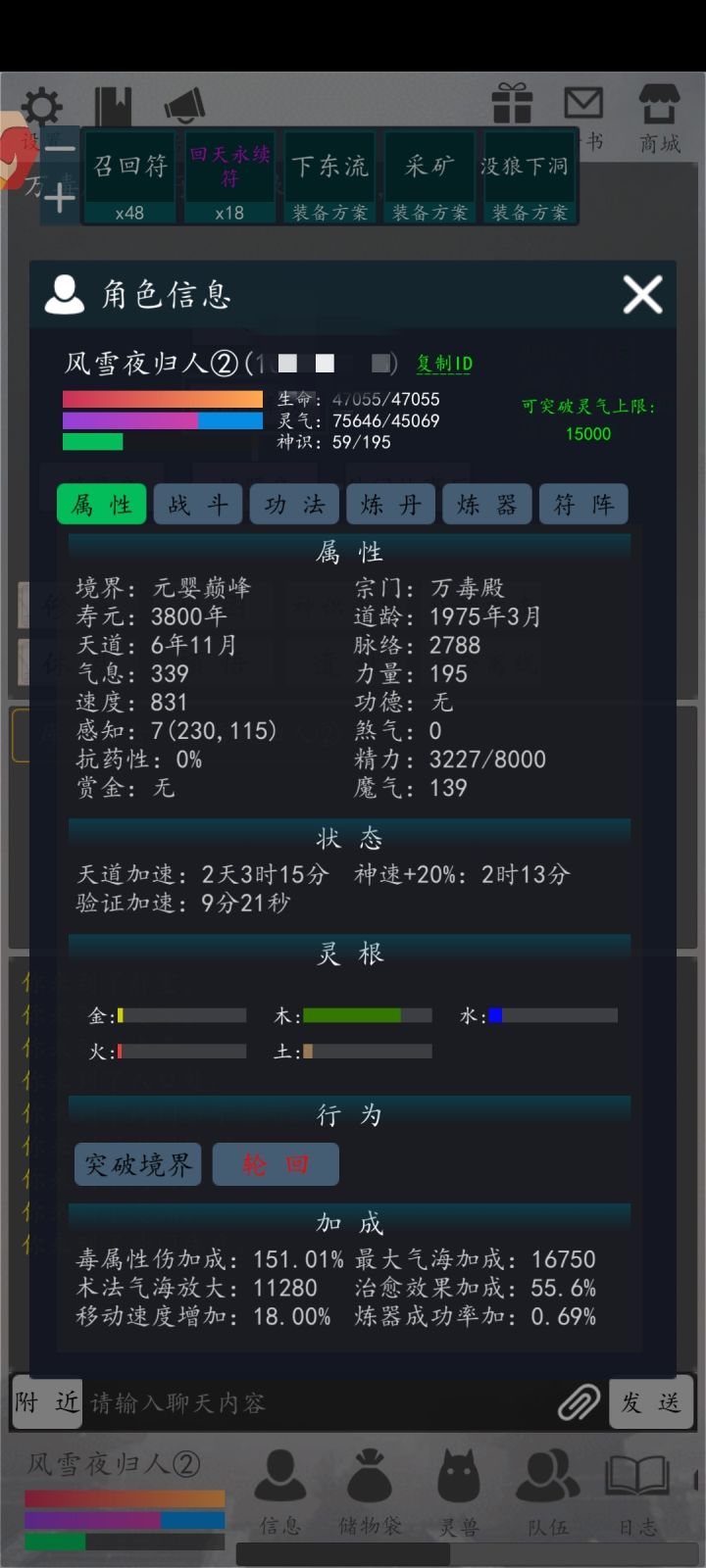 我拿着这几天赚的几万玉全买了天道,终于,我算是有点战斗力的元婴修士了。我开始下洞(刷副本),开始借大佬的尸体(大佬离线后人物能帮忙打架)开车,然后在某大佬的蛊惑下攒了三万多玉做了个玄武,轮回玩起了雷修。(别问我三万多玉哪来的,勤劳的开车人一天赚个一万玉不难)。