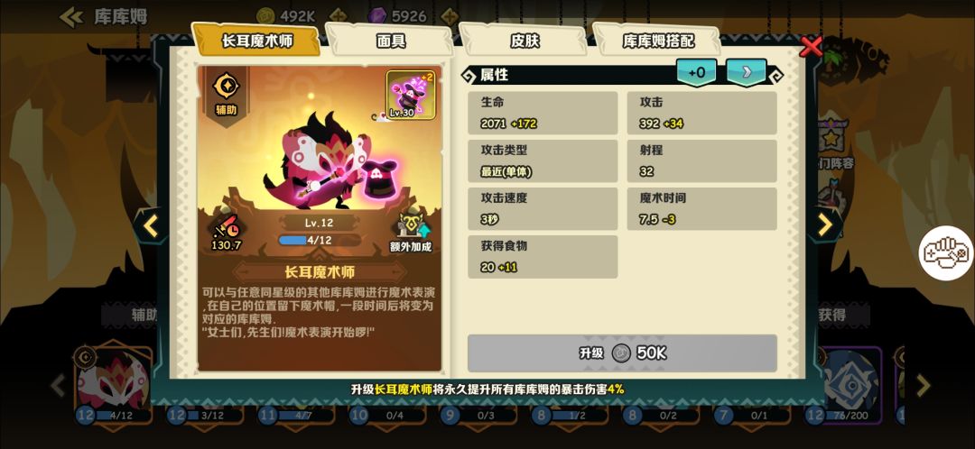 (注:新手可以先看完官方攻略再来看本攻略) 一、从开局到结束全程操作概述 ——怎样用有限的食物发挥出阵容搭配的最强战斗力,游戏进行中,随着食物的获取怎样稳步提升战斗力,游戏全程时刻保持最佳的资源分配,是咱们赢得胜利的关键💪! ——首先看一下库库姆的合成带来的提升 可以看到库库姆的合成共七个等级,咱们可以称为1级2级3级1星2星3星满星,2级是二倍基础攻击力,3级是三倍基础攻击力,1星是四倍基础攻击