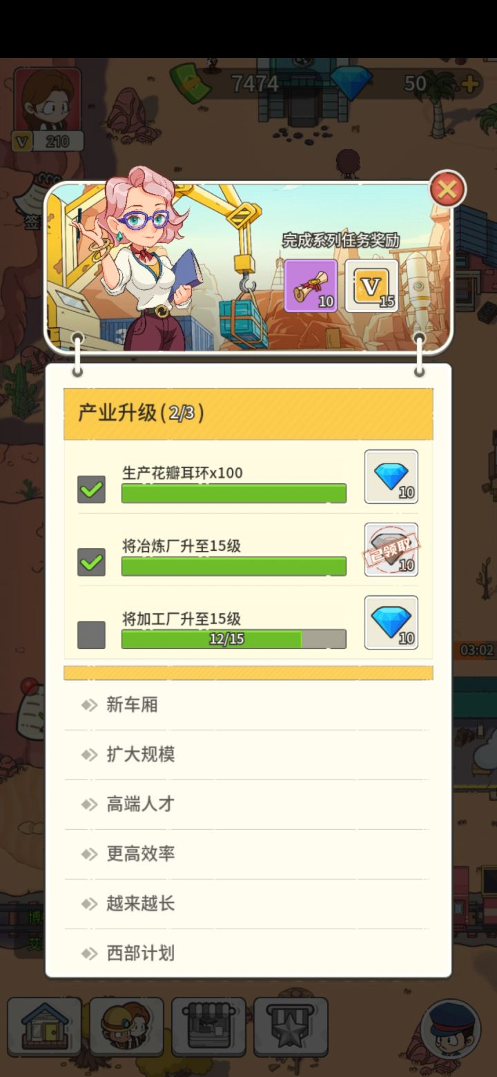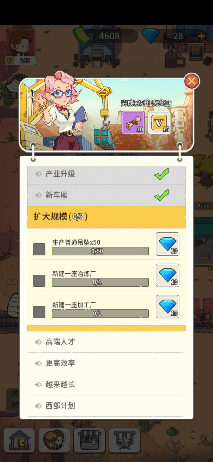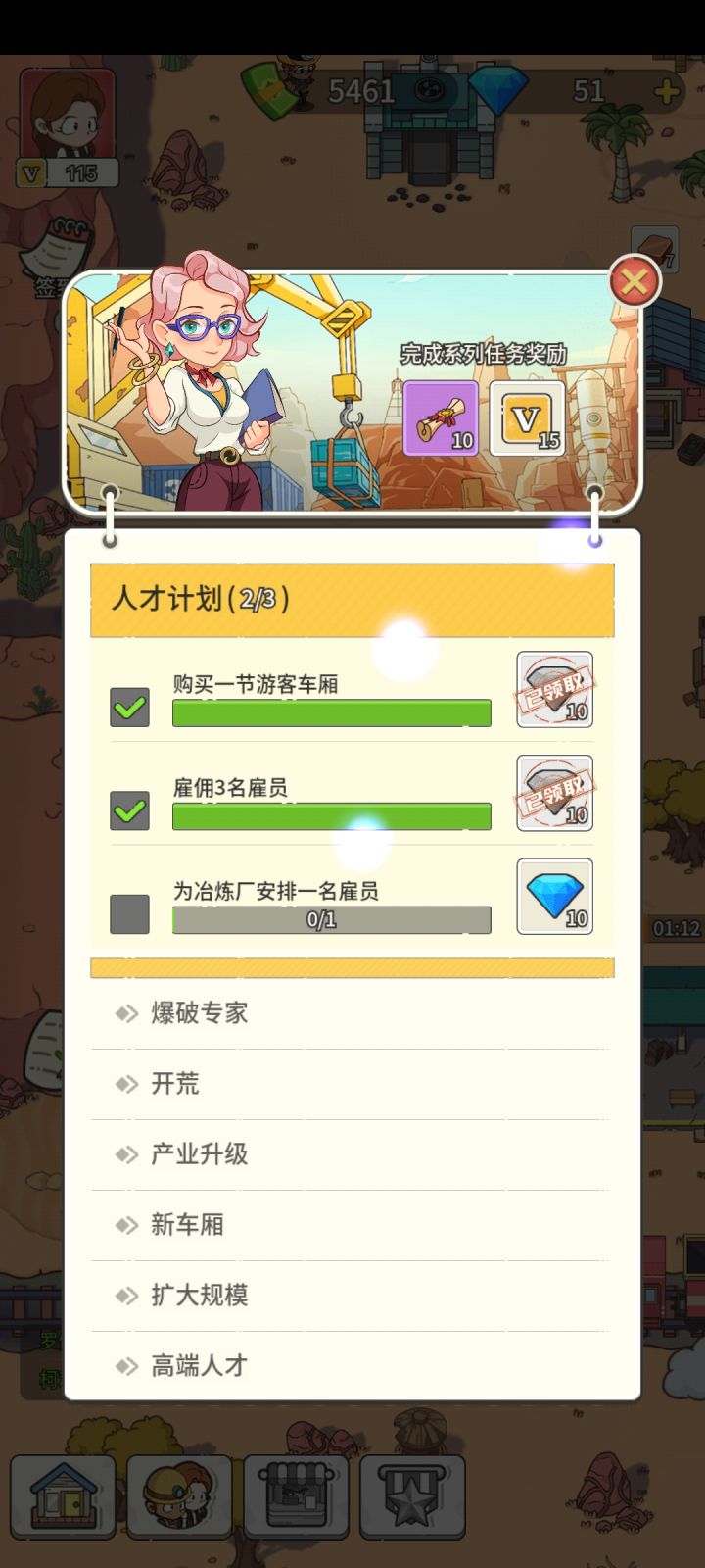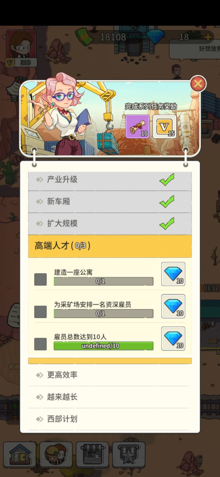 2,主界面:岩石炸开会变成地基可以造木屋(有任务提示再造,前期不用招聘,浪费钱,后面人才计划要招聘3个)第一次炸车站上方的岩石(河边的炸不完)