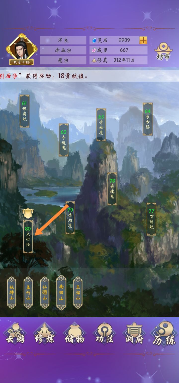 菜鸟上路,必备课程;作为一款只肝不氪的游戏,对平民玩家来说十分友好;但想玩好还需要注意以下几点:首先,必不可少的步骤,优先领取群内公告新手礼包,可稍解囊中羞涩。领取后的奖励可优先升级肉木。其次,随机加入门派,再去历练刷到极限,一般在25关左右,可以选换门派。门派种类繁多,此处可参考群内大佬收集的门派信息,再刷自己想要的门派。随后,开始地图探索,优先打外门弟子,待收集残页足够,即可升级技能增