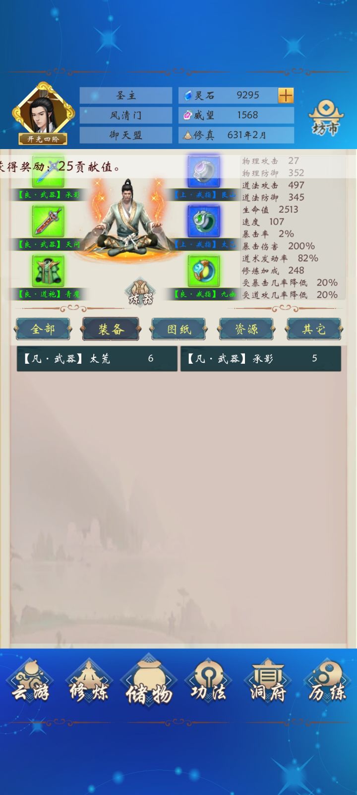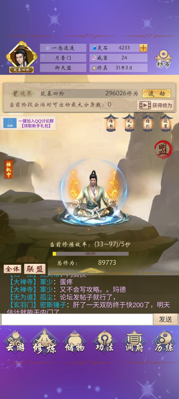 关于新手玩家怎么玩。 1.加群!加群!加群!重要的事情说三遍,群里大佬多,新人有人带。加群领礼包,输入礼包码领取福利,领的资源直接换了升级 洞府 建议优先升级食物和木材,还有聚灵阵 (这个增加回血量的,也很关键,升起来了会很省灵石)。 然后就是漫长的修炼过程。刚进去的时候,要时刻关注修炼,修为够了就渡劫,这是良性循环,越快提高境界,修为增加的越快。 同时开始刷门派(面板下方“功法”处,选择加入门派