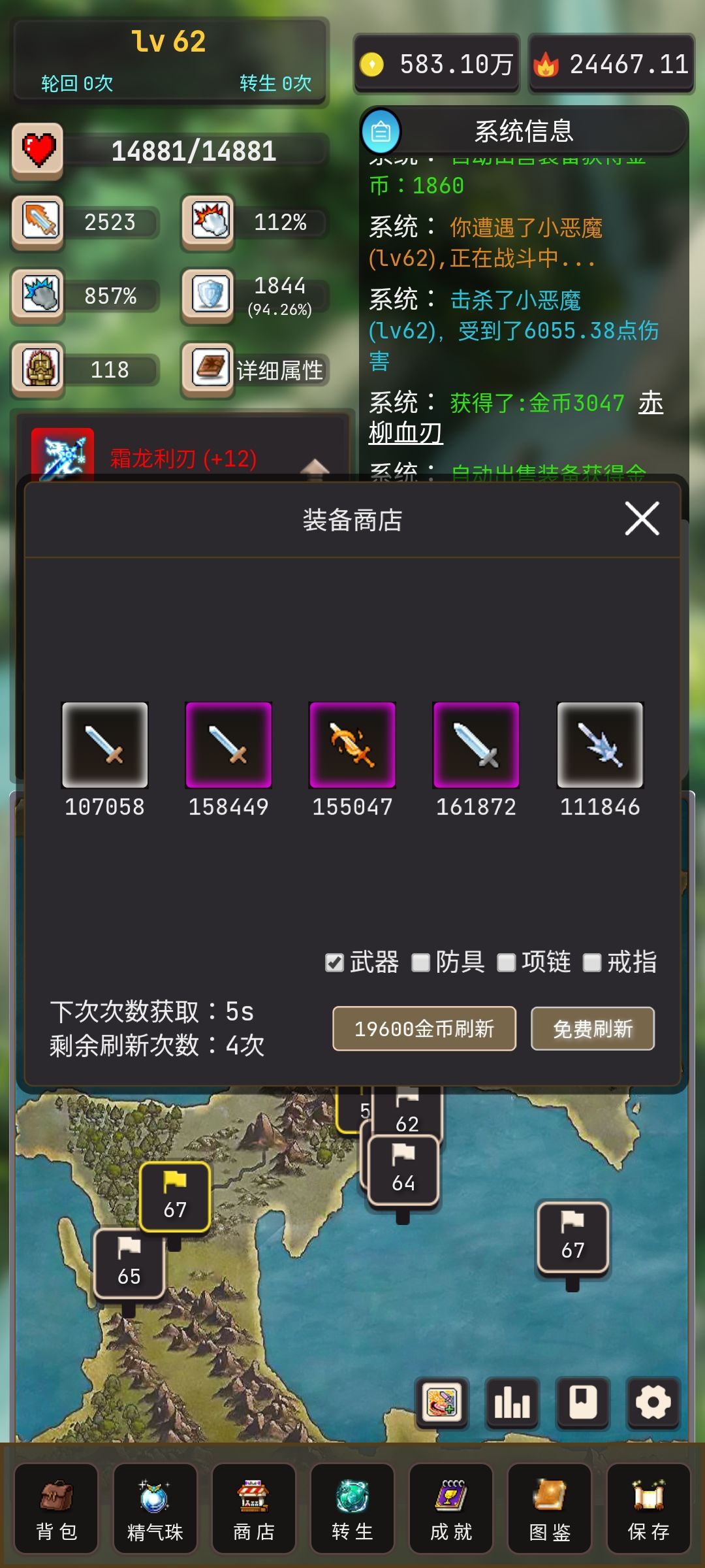 我们需要穿戴的是红色品质的装备,商店中有一个免费刷新的按钮,每5s刷新一次商店装备(注意:必须在刷新次数满时,比如5次时刷新,这个次数增加的时间才是5s。若4次以下的时候为30s)
