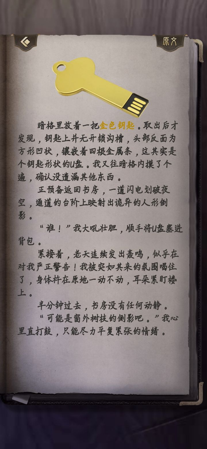 3.在古宅里接通充电宝后,镜子是做了个虹膜扫描之类的吗,然后利用蓝牙或者局域网打开了密室?(总觉得当考古和国风遇到偏科幻的剧情的时候稍微有点不协调)结尾看着像是出现了一位男主,估计会是恰巧路过,发现有个形迹可疑的人进入老同学家荒废已久的老宅的桥段。至于小偷的身份可能性比较多,来自任何势力或者碰巧出现都是可能的,就不猜测了。