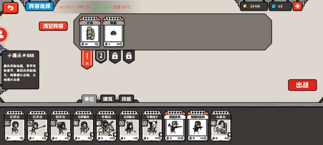 只有地雷可以一颗颗地雷炸 有沙包和地雷直接沙包地雷同时建中间,全炸死 有沙包和骑兵可以先造几个几个骑兵(加点其他兵种补伤害会更稳),然后沙包把敌人聚一块,骑兵冲锋全创死