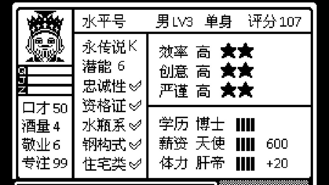 开局新手任务做完第一个任务放弃掉 可以获得一个隐藏人物—水平座 前期项目都靠这个大佬帮忙做 开局每周必刷简历 尽可能挑优质的 虽然前期咱们有水平座这个大佬已经够用了 但是咱们还是得留着点备用 招聘思路 个人认为 效率>严谨>创意 还有就是要注意学历(S)薪资(P)体力(B)这三个值 学历分为专科本科硕士博士 个人认为这个值几乎没什么用 影响不大 薪资分为魔鬼贪婪佛系天使 P那栏越满每个月发的薪资就