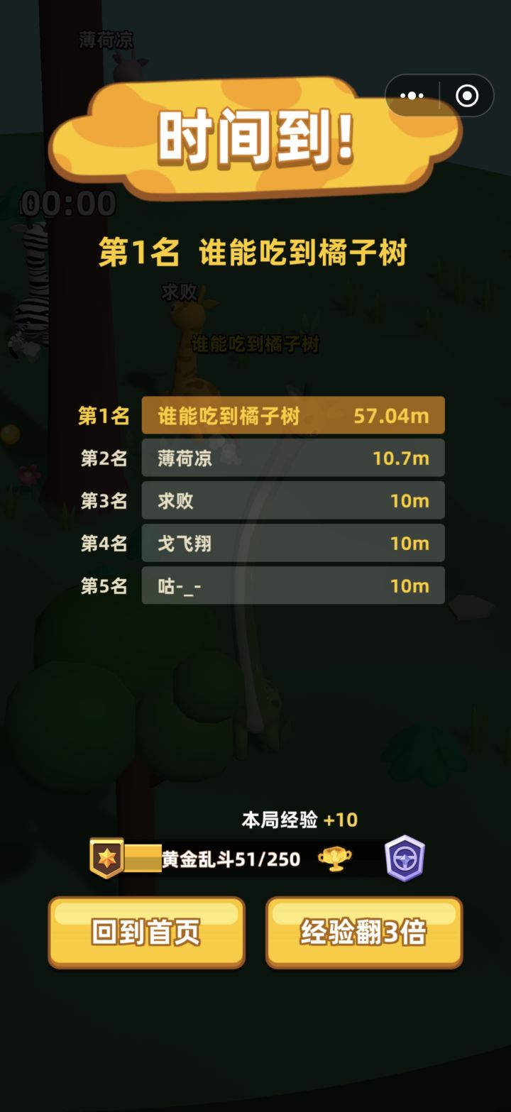 前面还有一个没讲到的点,这就是缩圈机制。我们所在的平台会随着时间越来越小,小到一定距离后通过结算排行榜,排行榜这点无可厚非,不多细讲。但是缩圈的机制感觉中规中矩,优处在于吃果子和一局短时间的游戏后期的竞争力更会强一些,毕竟圈缩小了,各个长颈鹿也挤在一起嘛,并且提升升高的机会也越来越少,竞争力随之强烈。但劣处在于缩圈机制只是把长颈鹿挤到同一个圈子里,这就导致里面的圈子很混乱,同时本身玩法上有些难以操控的机制,游戏性会显得更为混乱。