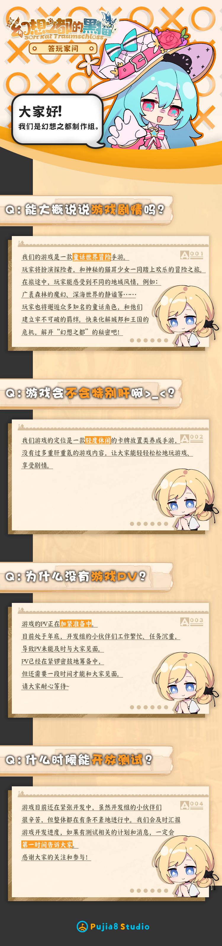 大家好! 我们是扑家工作室【幻想之都的黑猫制作组】,感谢大家对《幻想之都的黑猫》的关注与支持! 在游戏开放预约后,我们看到了大家的热情和期许,也有一些探险者提出了自己的想法和疑问,于是我们整理以下内容为大家进行解答。