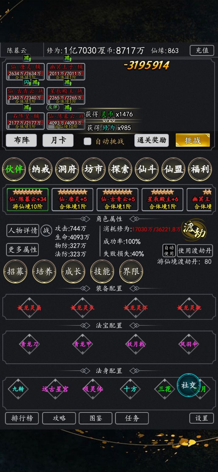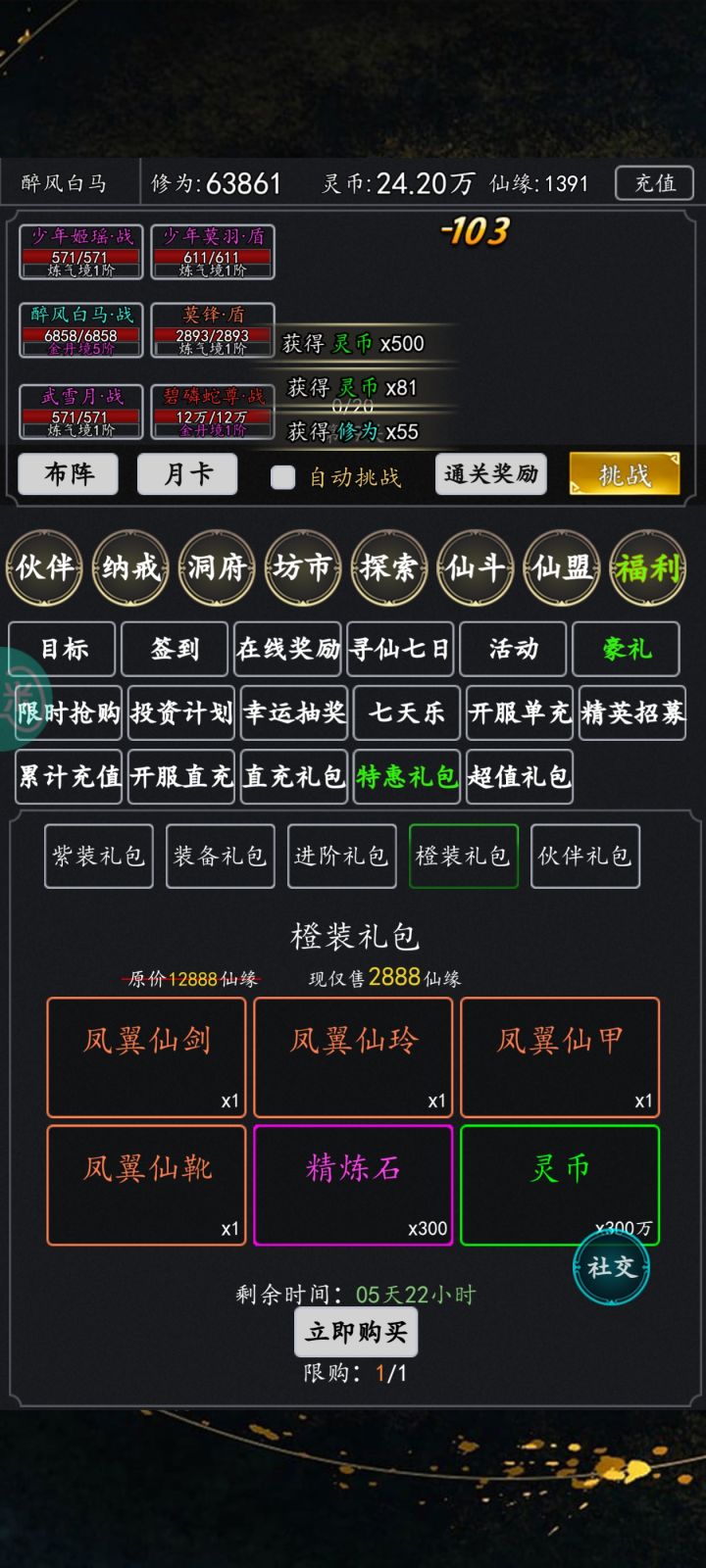 仙缘收入,仙缘用途 仙缘收入(合理掌握资源) 一天24*70的魔族入侵1500➕位面1500(200层开启)➕仙盟战200➕巅峰排名100加主宰位置800(200层以上位置)。除去日常购买神兽,道侣次数,进阶丹升星丹次数,一天结余2500以上。 仙缘用途 新区不能错过的活动,道友提前规划好仙缘 第五天福利限购礼包5100买600万灵液主角升红。 第10天限时兑换平民妖龙套装9150。 第18天特惠礼包购买9转能量法身10888。(17-21消费50000仙缘获得6个神兽属性丹) 第22天紫色法身两个8000(优先),法宝两个9000(青龙刀(优先),魔牛弓,不够仙缘这两个可以二选一) 第25天紫色法宝礼包8888(优先) 第30天,两个紫法身8000(优先) 一共4法身4法宝凑齐一套,基本为必买。