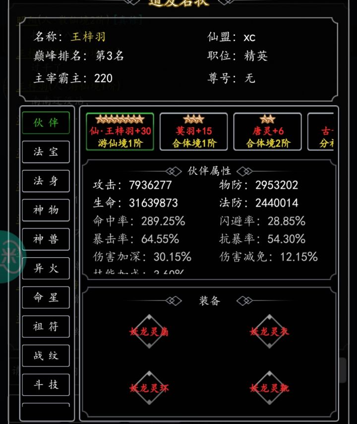 游戏id:王梓羽区服:712我玩这游戏也才33天,六氪,也不是什么大佬,前期在大乘卡了18天,来研究玩法搭配,前天才上的游仙,属性面板我不好看,图一乐就行了,今天只说阵容。首先萌新进入这个游戏以后对于伙伴选择有点迷茫,不知道哪个好用怎么搭配。如果你是六元党可以首充获得一只六元蛇如果是新号还有三块钱折扣券,首充三块,这条蛇可以陪伴你到大乘期300多关左右,前期伤害很高有毒buff持续掉血,但