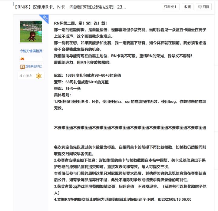 RN杯第二届,堂!堂!连!载!那一期的谜题剪辑,是血量翻倍,怪群套娃但杀敌充能。当时我看见一众蓝白卡颓坐在椅子上泣不成声,这个画面我永生难忘。那一刻我在想,如果我能参加比赛,我一定要赢下所有。如今奖杯就在眼前,我必须考虑这会不会是我此生仅有的机会。我相信向导能有现在的霸主地位,RN卡功不可没。重铸RN的荣光,我辈义不容辞!展现创造力,用RN卡突破极限吧!冠军:168月度礼包或者98+60