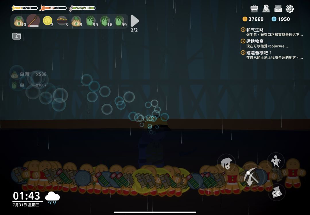 用铁锹先铲20个草种, 草种可以叠加种在一起,最后再用铁锹一次性铲完, 铲一次才掉2点精力,技能条基本上可以加一等级,同时也会掉大量姜饼人等材料,就是捡草和丢草有点麻烦,