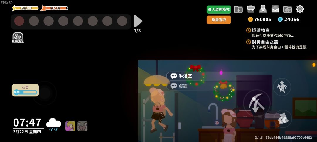 ①浴霸就是暖气灯,可以打开,跟洗澡一样不扣电费(洗澡可以恢复精力跳过时间,但是会消耗体力和加灵感经验,灵感等级高了之后就会变难包括读书日常什么的都会受影响) ②洗手池橱柜可以打开,两个橱柜各有一排半储存空间,什么都能放,别墅据说有三四排,等我一个月后看看别墅的橱柜空间。(水龙头可以用,不扣电费没有水费,作用是烹饪的时候加入变成特有的炖汤,跟便利店一块钱卖的纯净水一样的效果,缺点是不如纯净水可以直接