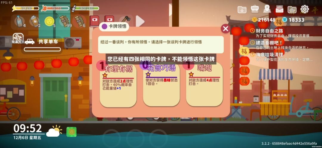 其实比较推荐卡牌语出惊人(该卡牌需要每回合第一次出伤害会大一点)和读心术,西装相对来说利润可能会大点,但是能买的起的人偏少,缺钱的话推销成功后可以讨价还价 #2025TapTap游戏节 #2025暑期游戏清单 #小生活悠闲小镇物语 #