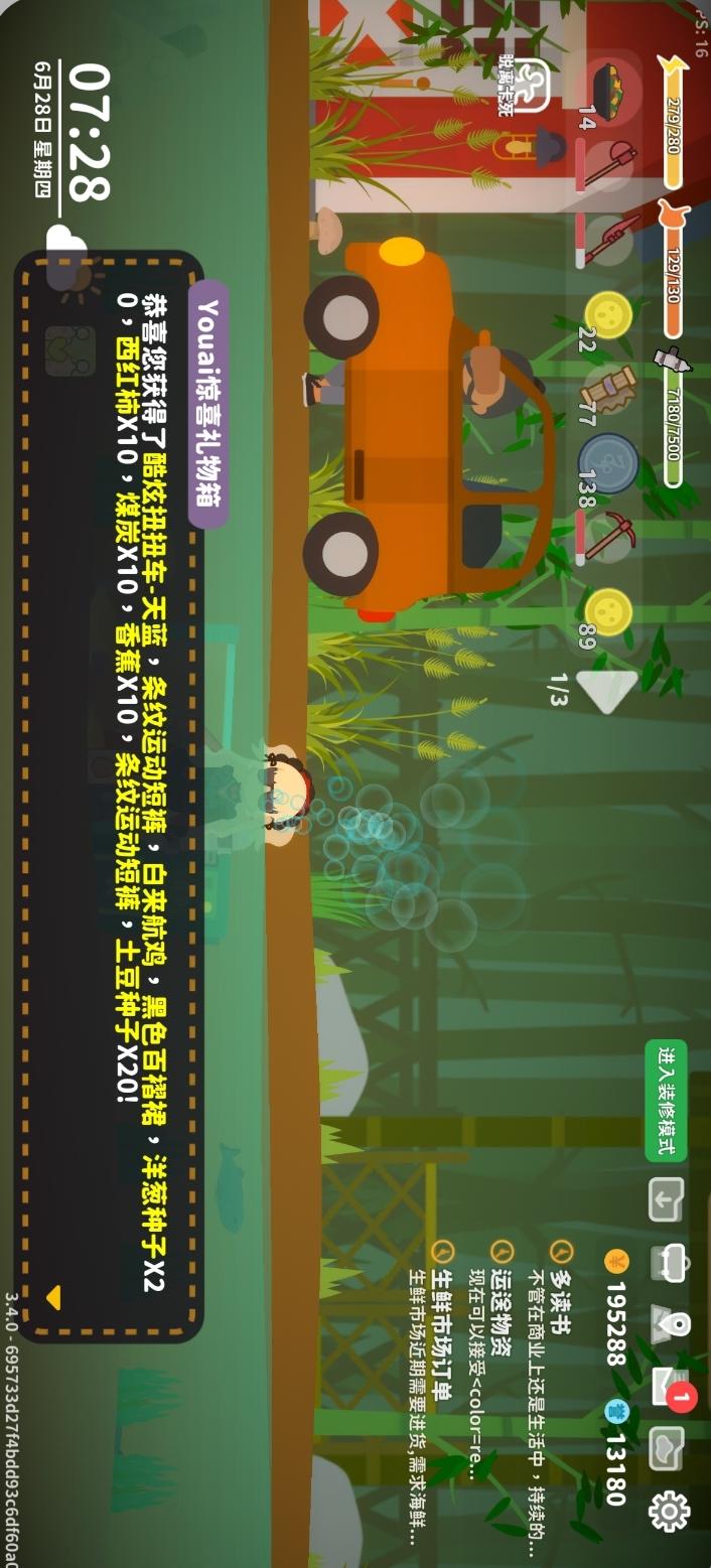 外卖骑手找到丁威接取任务,之后去汽车店买车,买了之后就能接单了建议早上去,在岗位上的人少,任务点离得近,还能刷到重复订单一次完成多个任务,尽早刷出机车和头盔,能提升移动速度外卖赚钱不多,但是可以挣人气、红包、旅行币等等,适合前期过渡农民在竹林找到陶林,对话后接取任务,锄20棵杂草,以后就可以开始种菜种树养殖了。比较休闲,可以把作物囤起来售卖前期种茄子,中期种玉米和草做普通饲料,浇水可