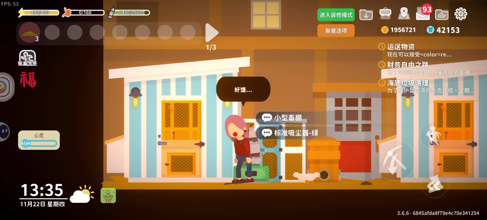 作者什么时候可以出一个染房子的染色桶,小房子蓝色,大房子红色,真的很难以区分,每次我都要凭借自己的记忆力去区分,我有很多个大红色的房子,还有很多个小蓝色的房子,因为要养殖养鸡,几乎每天的时间都花在养殖上面了,因为我有时候可能会忘记。所以每次都反复来回看,能不能出可以染房子的颜色,这样子也好利于区分,不然太累了,还有那个黄焖鸡米饭,档口点餐能不能便捷一点呀,一个一个的点,很累很累的,能不能可以有左右