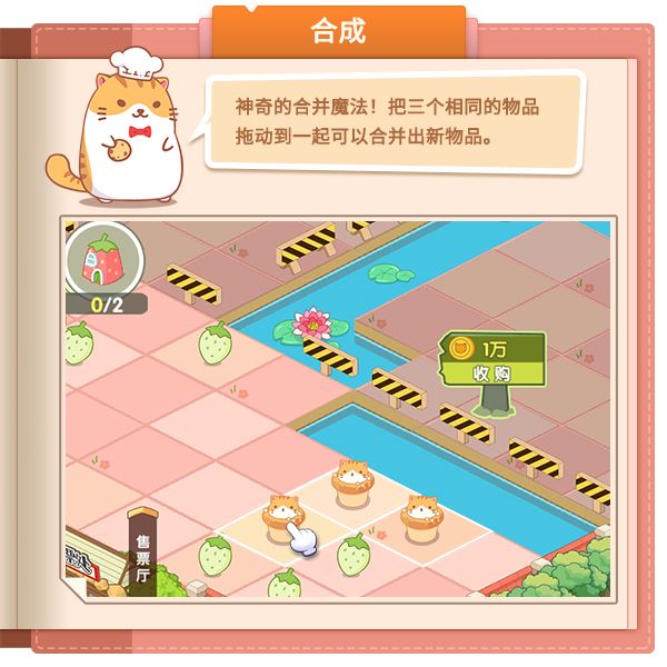 欢迎回到开心动物园!曾经这里是一个景色优美、商业繁荣、小动物们都开开心心地在此安居乐业的美妙乐园,但是由于种种变故,现在园区已经荒芜了很久,需要回归的乐园主人来复兴重建。首先,让我们唤醒被坏巫师封印起来的大橘。这就要使用到我们神奇的合成魔法!把三个橘猫图案的杯子蛋糕拖到一起,就可以合并出奇迹——把可怜的大橘解救出来。然后,我们可以开始帮助大橘重建它的猫咖了。就地使用地上的青涩小草莓,把