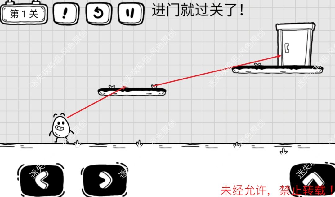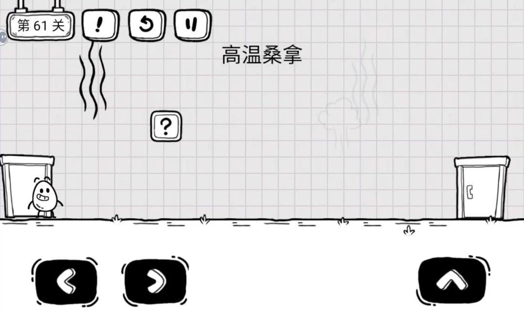 镜像模式 1-15关 攻略【普通模式最后一关增加传送门】 第1关 在左侧平台下跳跃 第2关 推动木箱挡住门逃跑的方向 第3关 向左进入起点的门 第4关 本关可以连跳,需进入右侧门两次 第5关 点击“暂停”进入菜单,点击“铃铛”使用门铃 第6关 问号方块可被拖动 第7关 点击右侧门,再点击新出现的门,并将出现的门拖动至最大的门上 第8关 拖动气球到第二个平台上 第9关 拖动箱子到门的上方将门砸晕 第10关 从平台跳下,并点击茶叶蛋打开降落伞 第11关 点击左侧门并跳到出现的茶叶蛋头上,重叠数个茶叶蛋后再操作向右移动 第12关 拖动“暂停”按钮到茶叶蛋不会被刺 第13关 点击左侧门并进入,点击水龙头放水后返回并顶问号方块 第14关 大头钉可拖动,茶叶蛋可踩在线上 第15关 点击左侧门,并跳到门上