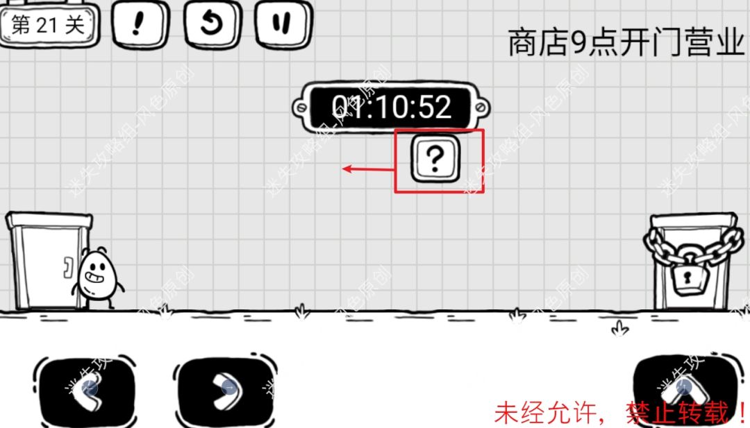 第21关攻略 21.如图所示,将标注问号的方块移动到时间下方,之后通过跳跃来顶方块,将时间调整到9点即可通关。 21 21.1 22关攻略 22.如图所示,将上方的三个图标移动到中间作为我们的垫脚石就可以通关本关了。 22 22.1 第23关攻略 23.在本关中,我们可以直接点击并拖拽茶叶蛋,直接将茶叶蛋移动到右方大门中就可以了。 23 第24关攻略 24.如图所示,在茶叶蛋跳往对岸的过程中,