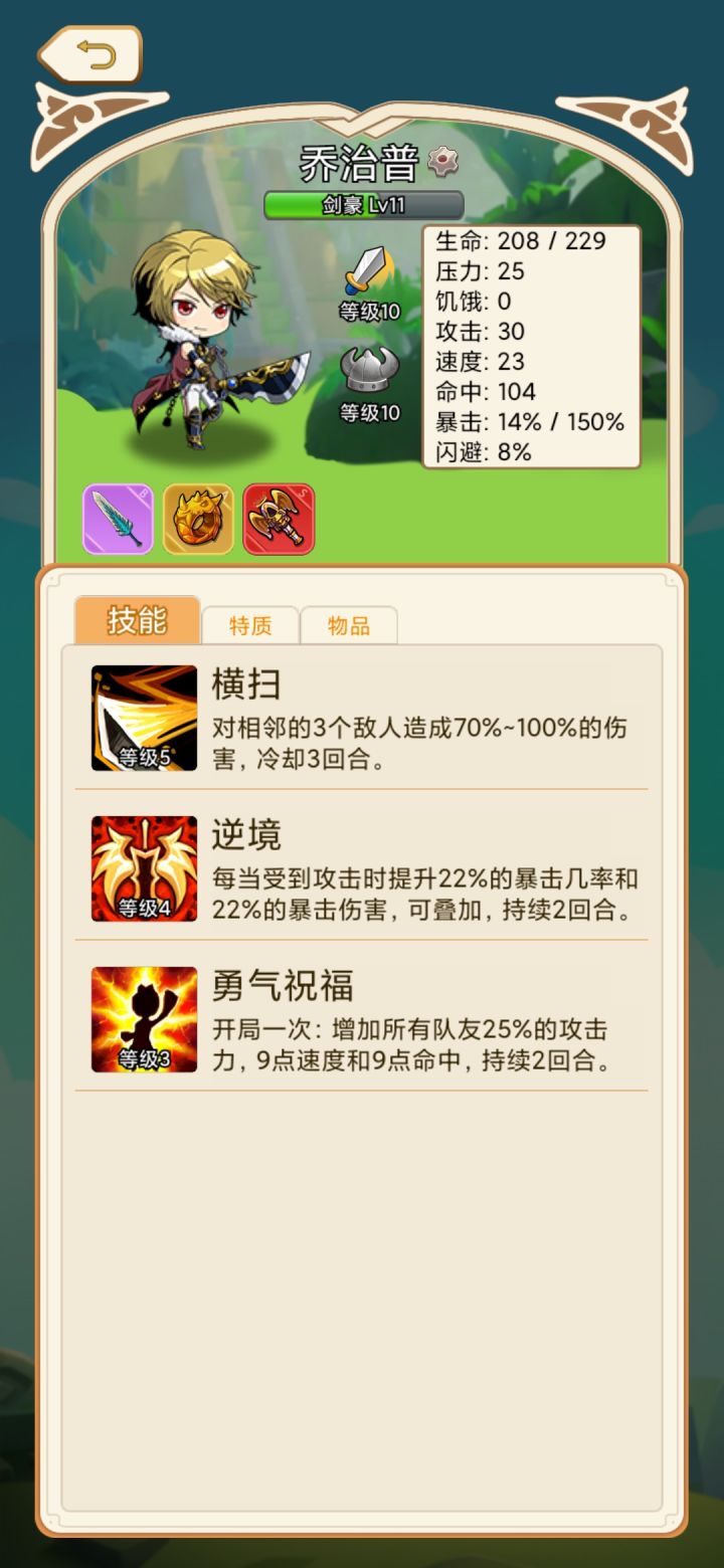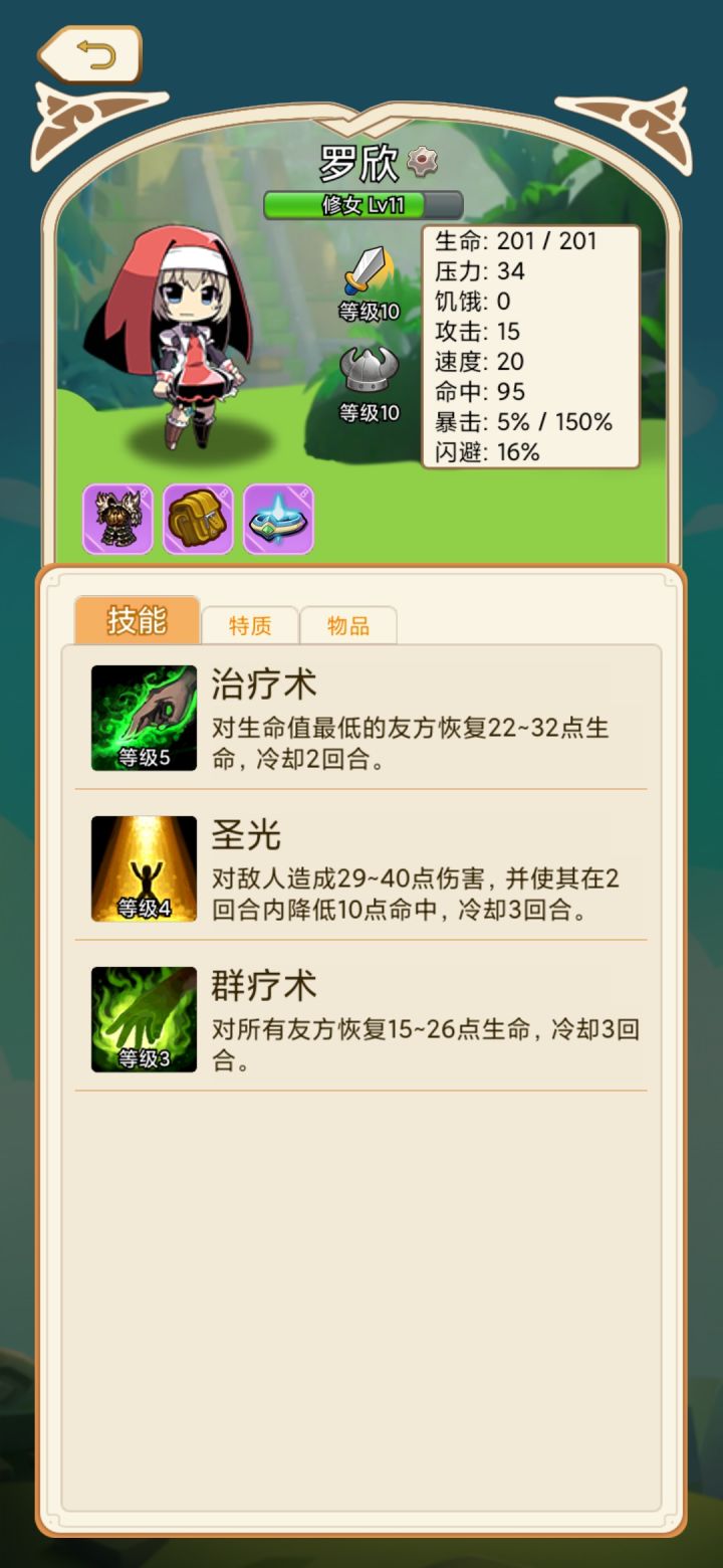 ①首先讲讲队伍构成,游戏目前铁三角-剑豪(高输出+集体增益,初期强度一般,7级质变),元素法师(3级开始掌控全场),修女(从头到尾好用)