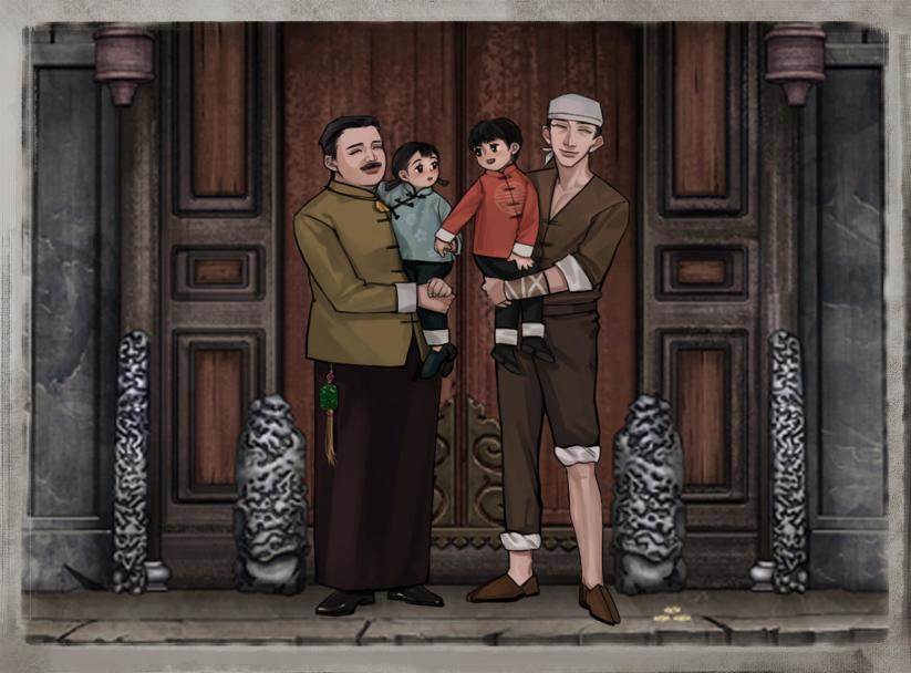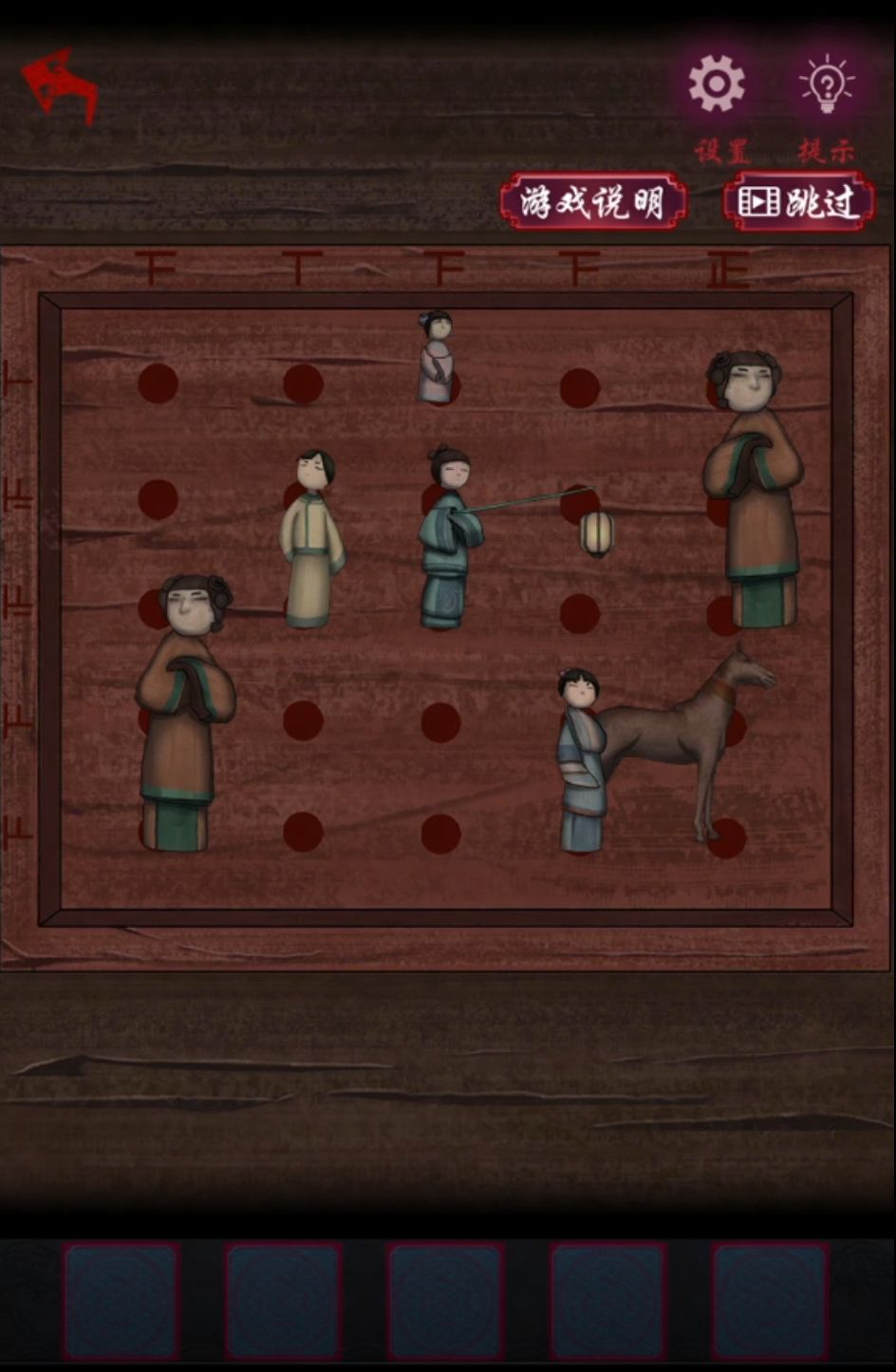 第六章:招魂 1.(收藏室)点击桌子上的状元盒,放入【铜钱】 2.根据钱老爷房间的折子和盒子上的箭头摆对人偶的位置(童生-秀才-举人-贡士-进士-探花-榜眼-状元、深蓝天蓝黄橙粉紫深紫红) 3.盒子打开,获得【长命锁】 4.(钱老爷房间)拿【虎头鞋】、【棉袄】和【长命锁】给招财童子,获得【钥匙】 5.(院子)点击小门,用【钥匙】打开 6.(祠堂外)点击祠堂的门,查看上面的图案 7.点击石桌,根据门