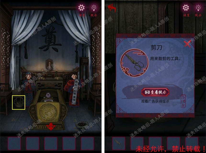 🍀第五章攻略🍀 116.拾取篮子里的【剪刀】。116.1 117.调整木牌,使图案和节日对应,得到【挽联】。117.1 118.将【挽联】给左边的纸人,根据2个纸人手指的位置,得到线索【凄】、【水】、【年】、【恨】。118.1 119.根据纸人的线索,调整机关,得到【孔明锁】。119.1 120.拾取柜子底下的【铁锹】。120.1 121.完成桌上的盒子机关,得到【半块龙纹玉佩】。121.1 12