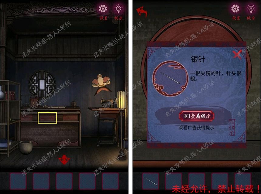 第六章:招魂 1.(收藏室)点击查看柜子里的竹龙身上的箭头和色块(黑左、白右、黑右、白左、白右、黑右、黑左、白左) 2.点击桌子,查看上面的折纸(折纸不同的折法和东南西北对应的词) 3.注意看桌子上的卷轴上的线索 4.点击打开抽屉,获得【银针】 5.(钱老爷房间)点击查看桌子上的折子 6.点击盒子,根据折纸上的信息和盒子上的折纸的状态,翻至对应的词(东:升官、南:职小、西:劳民、北:亨通) 7.打