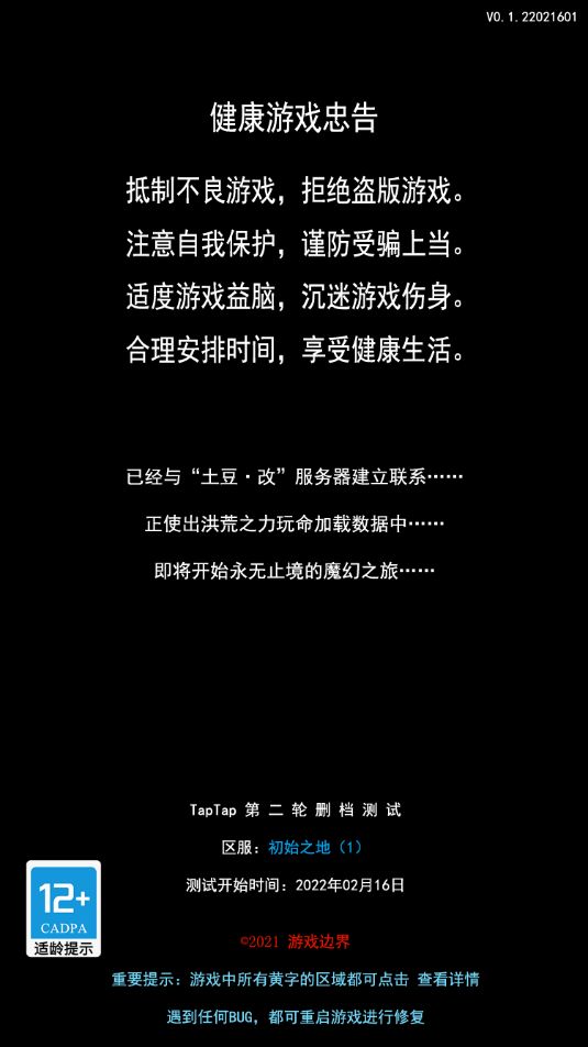 各位巫师好,我是凌霄云。2月16日TapTap第二轮测试开启。本次测试开放服务器:2月16日:初始之地(1)2月18日: 河湾镇(2)2月22日:上古废墟(3)1.密令请注意游戏内公告、群公告;角色养到10岁后,点击游戏中的人物页面的“密令”入口,输入即可兑换;2.本次测试为删档测试;3.测试持续时间原则上为十四天以上,十四天后服务器最后剩下的玩家人数太少则关闭测试,测试结束前一周