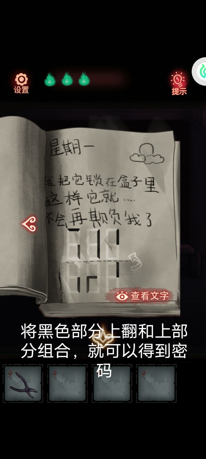 第1-4章Tip⒈吃我喝我:由“仙=0,境=2”可知,规律为计算字笔画内所含的“口”字有几个,在计算“吃我喝我”,得出密码.第5章Tip⒉折纸图案密码:共有六个图案,图案一与图案二重合抵消,得到图案三,由此可知规律,图案四与图案五重合抵消,得到图案六,再根据柜子里的箭头轨迹,得到开门密码其他小游戏操作附上……(。ò ∀ ó。)