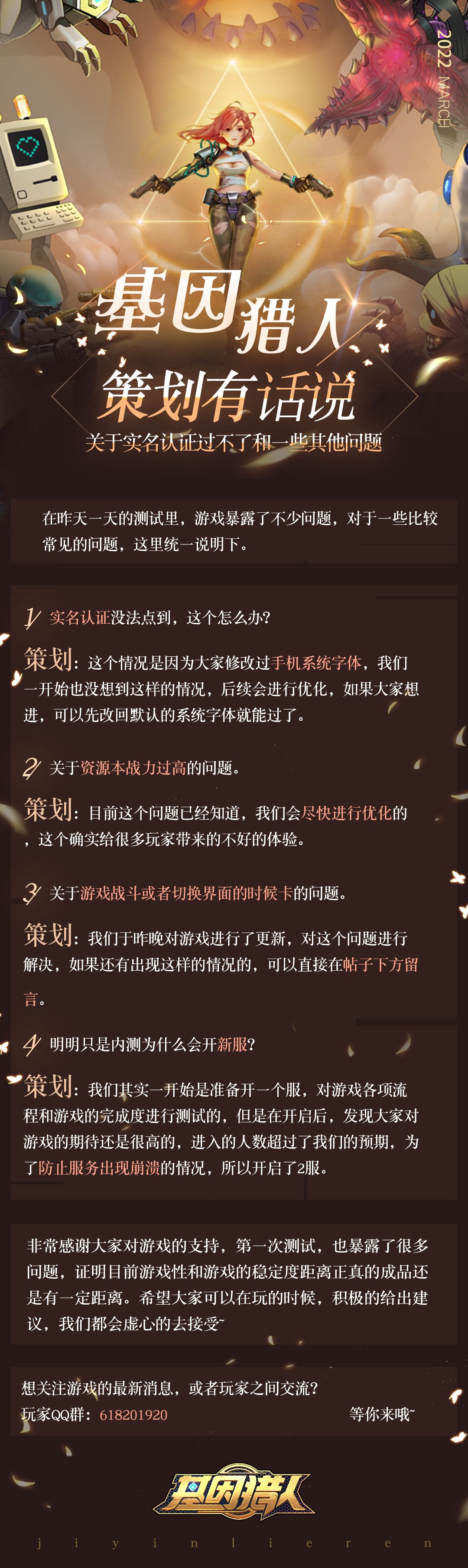 各位冒险者大大: 《基因猎人》于今日(10月24号)上午10点全渠道首发,由于我们的经验不足,对服务器承载作出了错误的预估,导致服务器内存溢出,致使各位大大无法正常登录游戏,严重影响了各位大大的游戏体验,对此我们深表抱歉。 在团队发现相应问题后,我们第一时间针对出现的问题进行了抢修并进行了相应的补偿。 但经过团队的讨论,觉得目前已发放的补偿并不能表达我们的歉意,特此再次为我们的失误为大家重新发放一