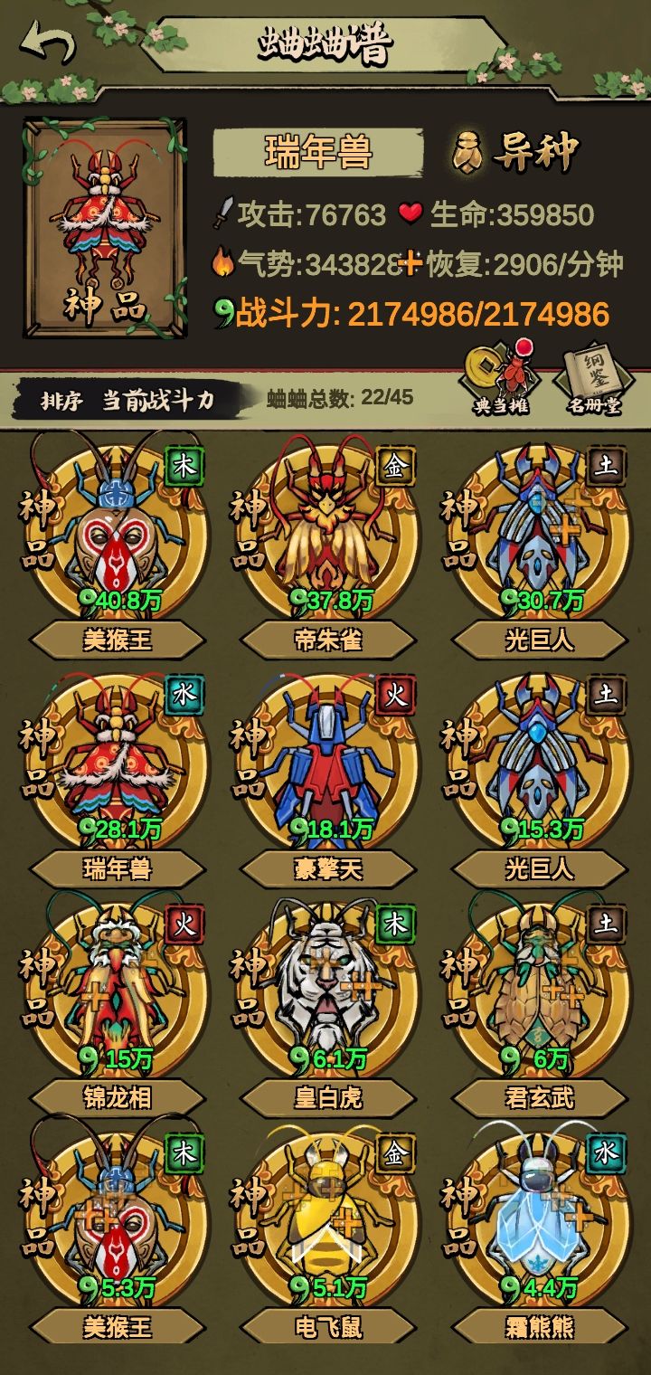 浅谈一下心得:1、肝了半个月左右,可以算毕业了,剩下的是长草期。2、开局随意用品质高的,主力肯定是年兽毫无疑问,45分钟在线就能获得。尽快通关一张大地图,把聚宝盆拉满,主要的货币来源,无论多少级都是1小时存满。3、享受抓蛐蛐,开图鉴的过程,这里不建议在野外刻意抓神品,浪费很多时间。神品除了白虎和玄武,都可以培育的。培育屋,除了荒野(培育速度减半那个)的词条,其他都是没用的,时间就是金钱,荒野培育出好东西的概率都是一样的,而且时间减半。4、本人没有刻意在野外刷神品,基本都是完美图鉴了,除了白虎和玄武需要参赛获得。神品培育获得的难度:瑞年兽>光巨人>美猴王=电飞鼠>豪擎天>霜熊熊>帝朱雀=锦相龙。仅供参考,也许每个人的概率不一样,哈,毕竟我也只玩了一个号。