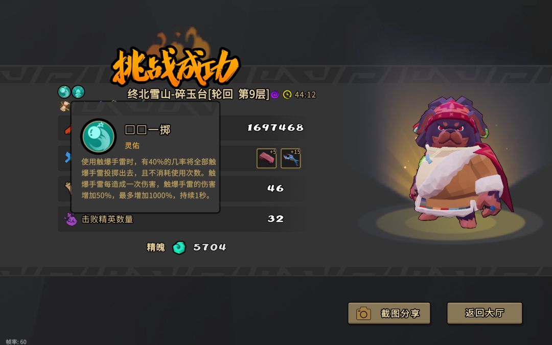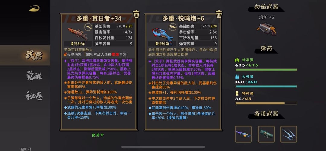 轮回九层,单人如何刷到最高伤害? 1.选择可以增加弹道数的武器铭文,我这里选择青铜虎炮,可以看到弹道数加一,最后在双持下基础伤害8000以上。 2.初始灵佑可以选择暴击狂热和铁匠传人。之后在打雪山前可以把灵佑换成适合狗的兵贵神速,生命之力和武器全才任意其二就够了,再加上一个其他加伤害的灵佑 3.最重要一点是在每关有行脚商和精魄商人的情况下刷秘卷,将带有幸运一击的秘卷和可以组合成一套的秘卷刷出来之后