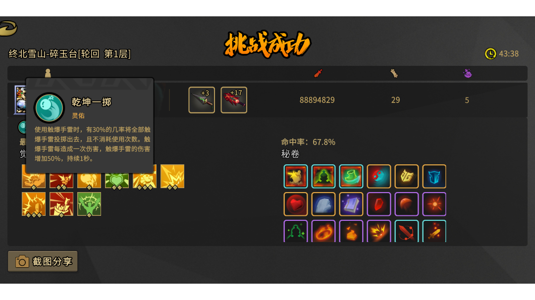 轮回模式的加持,再选上我这些秘卷,觉醒有手雷增加伤害的就点,保命的也要写,因为主打手雷,双持就没那么需求了,就是玩的时候有点卡😂