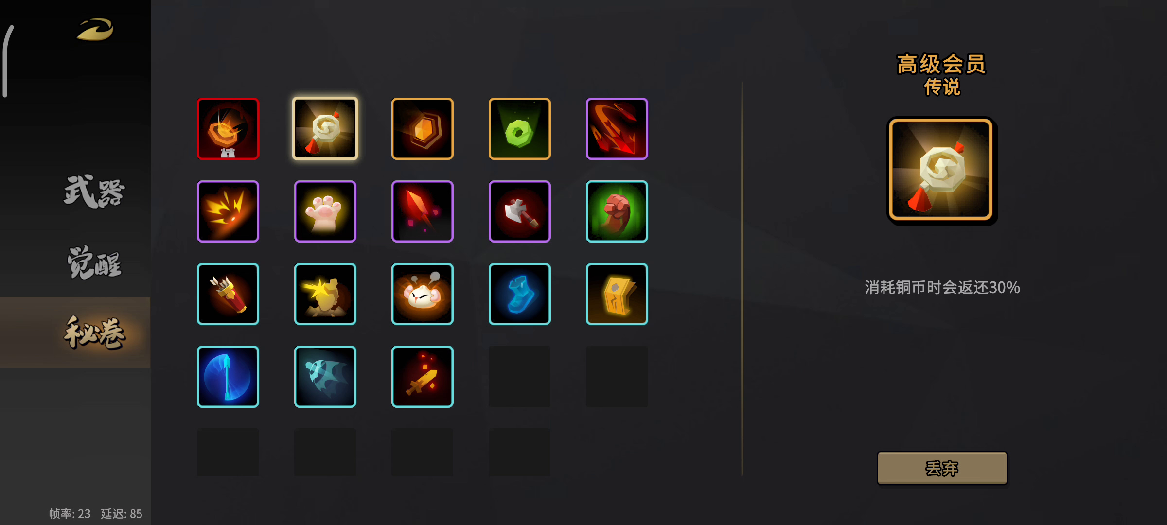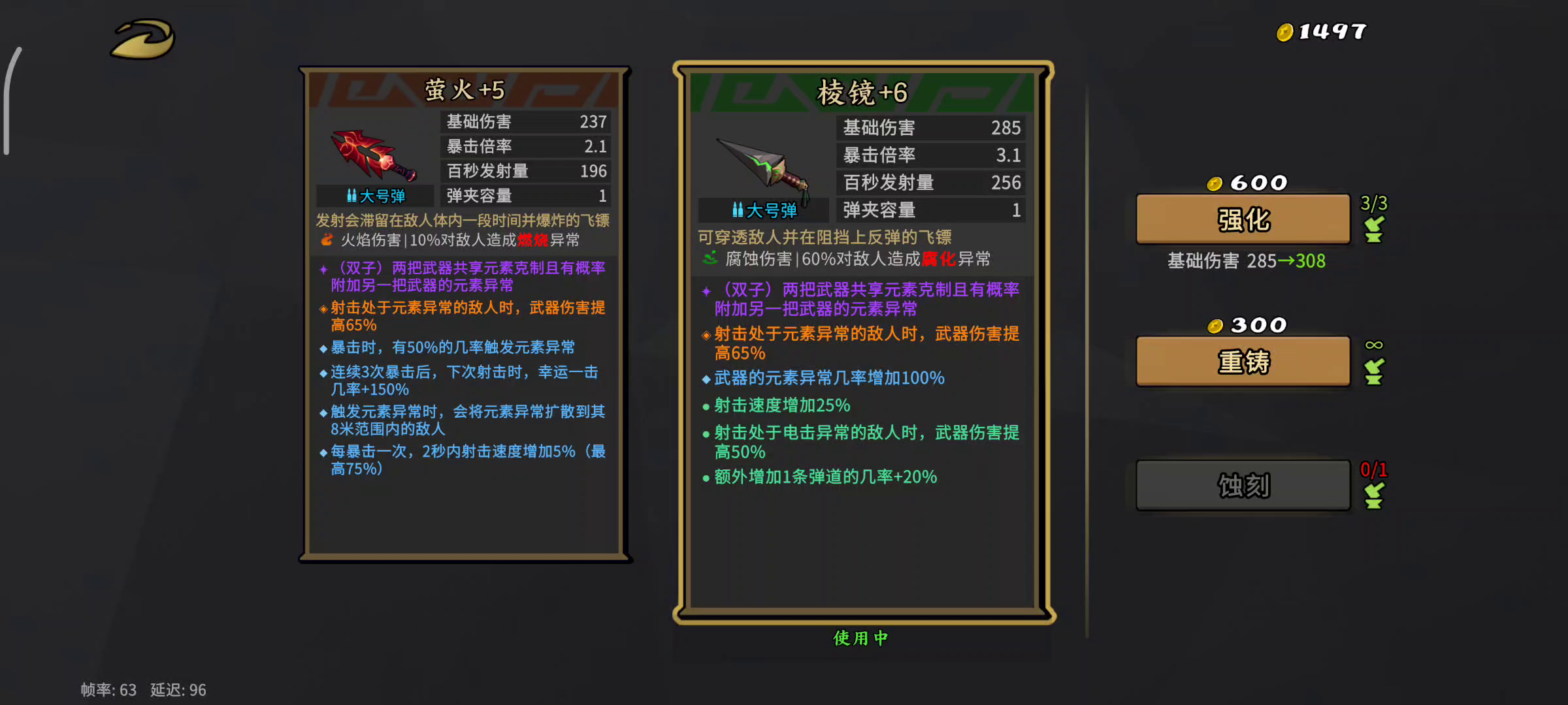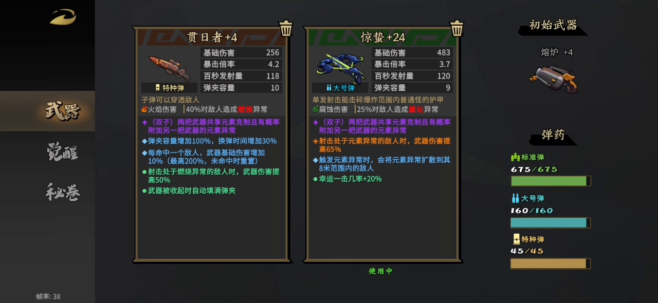 今天运气好,捡到的武器都合胃口。伤害最高还是得玩火毒。秘卷还没有集齐两个火的,所以造成火焰伤害还会扣血,不敢硬刚(虽然会回血但是会扣盾)