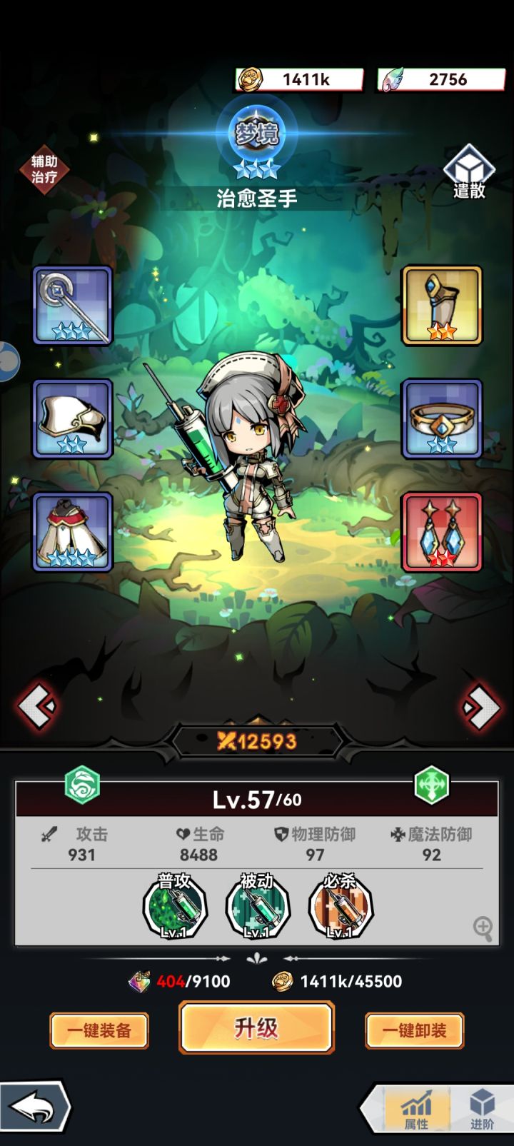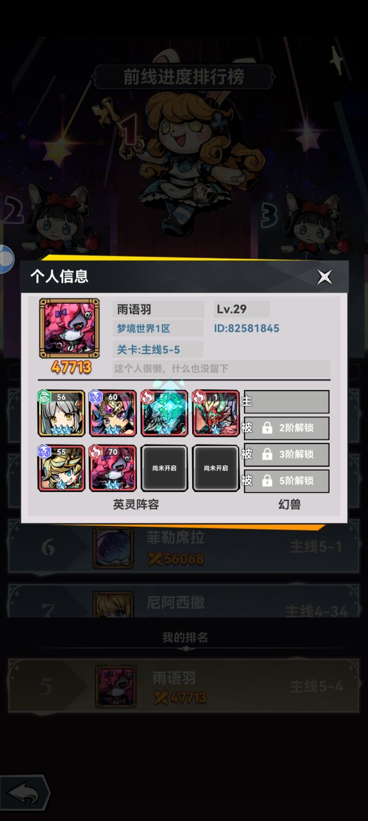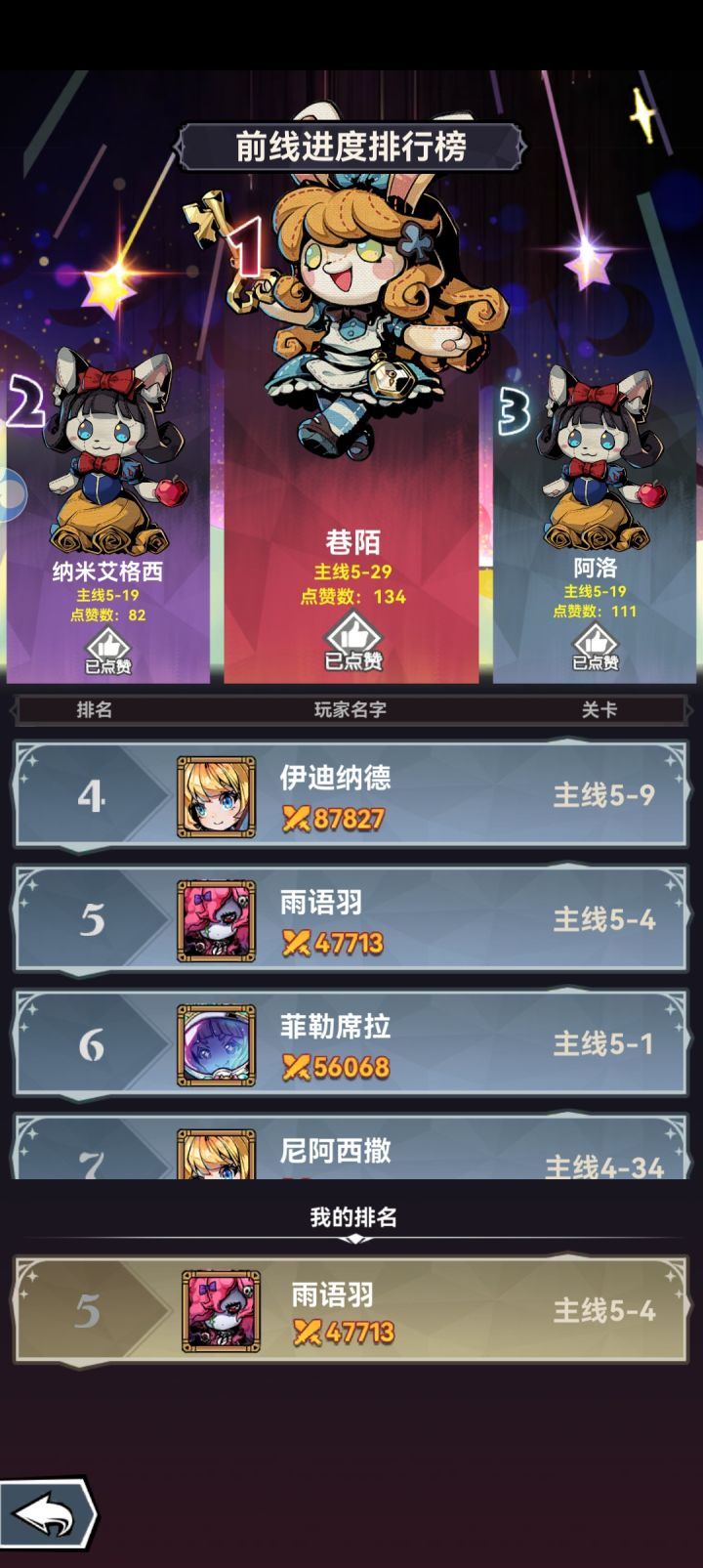 输出位火系镰刀魔偶 群攻清屏,输出拉满电系翠色闪光 boss收割抗伤拦怪电系天空骑士 献祭送的电系蝴蝶法师快速升二星,解锁被动技能火系红孩儿 被动叠加燃烧,配合镰刀魔偶被动(我还没两星,暂时用的二星巨兽扛)治疗一个ssr没抽到,就用的三星sr奶妈闯关时升星优先度魔偶>翠色闪光=天空骑士=sr奶妈四个角色够了,另外两个划水零氪目前进度榜第五,卡30等级了,刷了个噩梦回溯做案例实