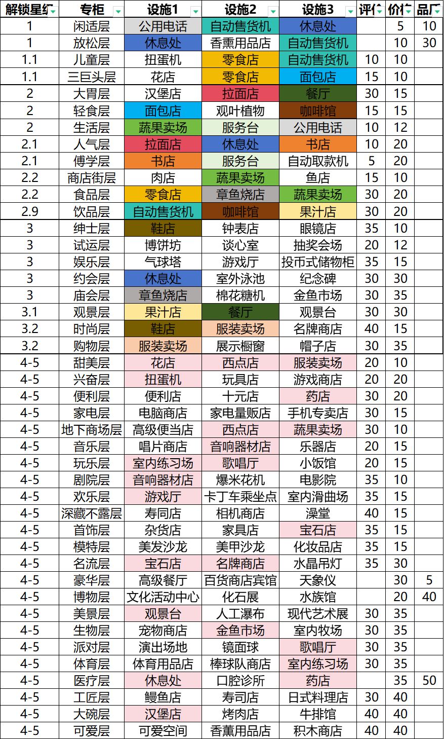 前言,必看:《百货2》这款开罗游戏的店铺获得方式分为三种 1.每一星级提升后在引入的商会中解锁 2.通过满足客人的需求,让客人由顾客变为“常客”(注:大部分的关键店铺都是由这一步获取,因此了解顾客变为常客的要求尤为重要) 3.通过每年两次的排名统计获得奖品建筑(注:一部分顾客的变常客需求是通过排名统计的奖品建筑满足的,因此尽量使自己能在排名中胜出) 总体收入=每月销售额-维护费 而维护费作为一项固