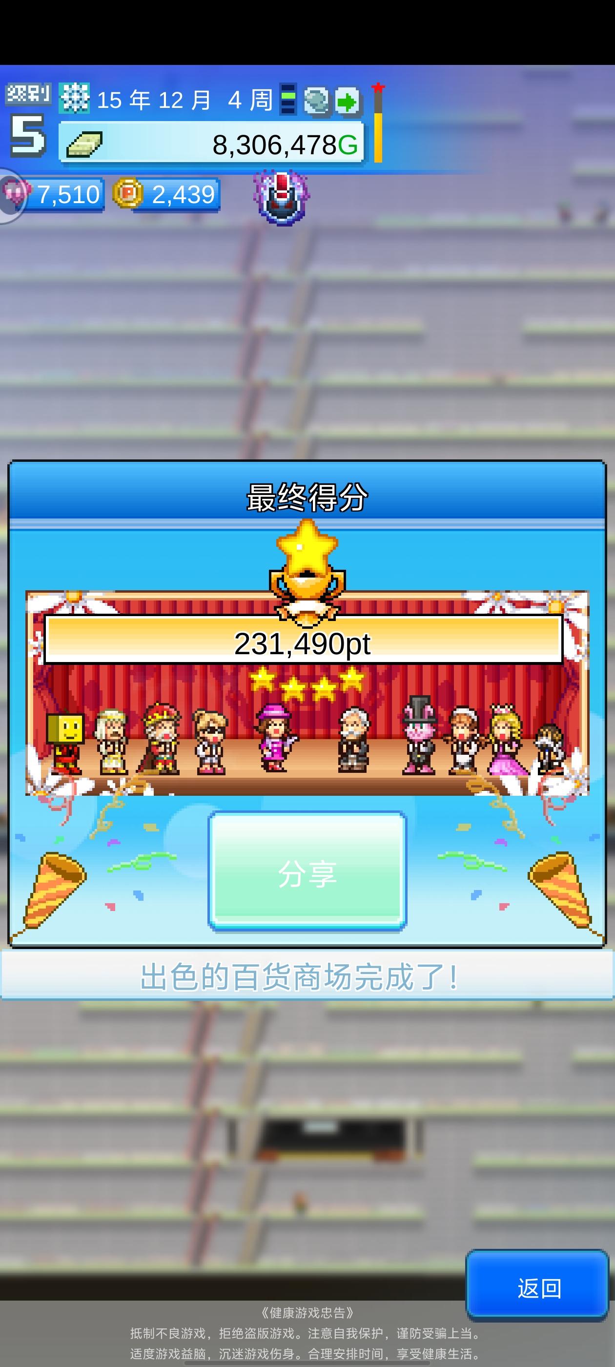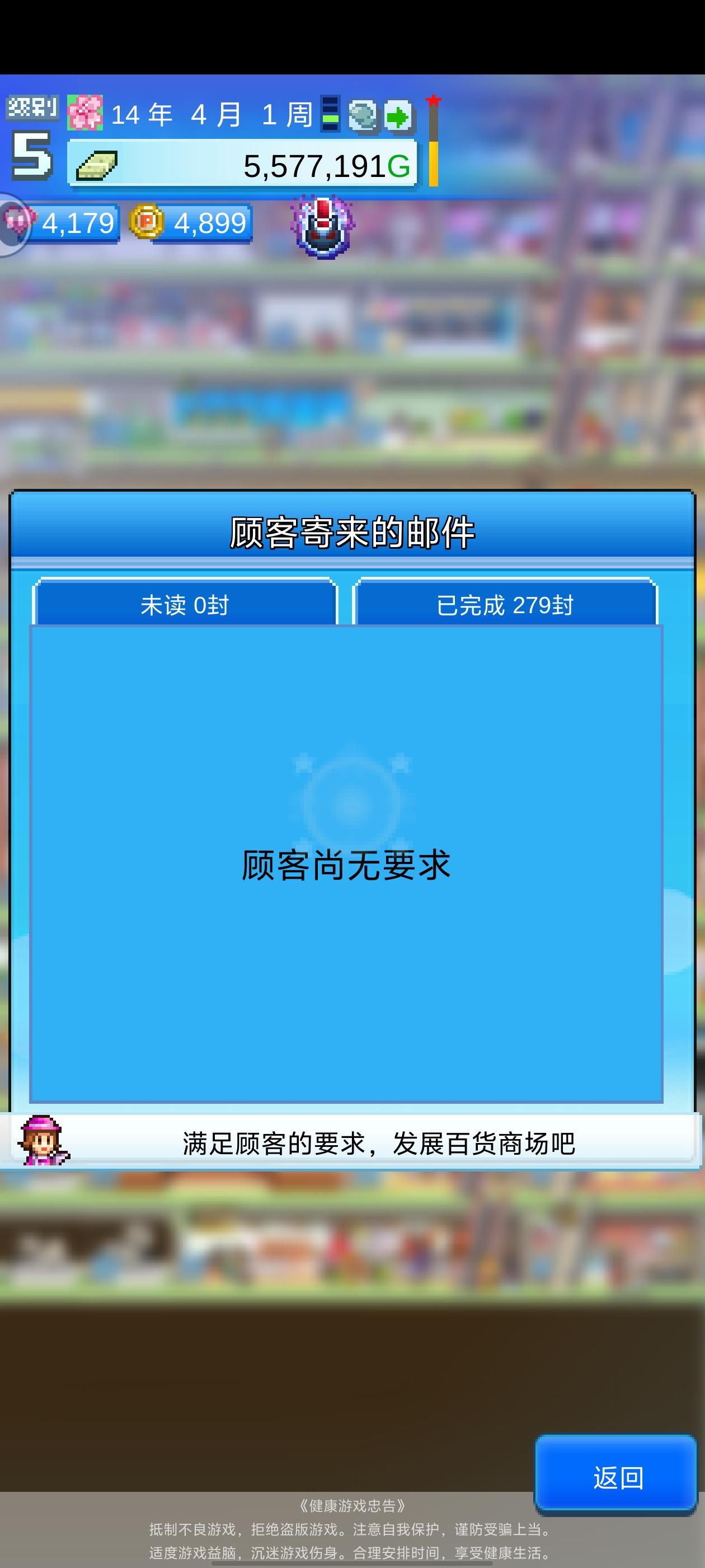 最近没啥游戏玩,爆肝三天,开罗永远的神本来13年就全部弄完了,但游戏一定要15年才能通关,通关之后二周目只能继承专柜词典,本来想玩二周目的,但是二周目没有新内容了。全邮件任务全专柜全顾客最终得分最后放几张百货大楼的图,布局是照着大佬的来的,省了很多时间。 玩之前看了不少攻略,因为想一次就玩完游戏全部的内容,像布局专柜这些都需要花很长时间,于是就看了攻略。但还是有很多东西需要自己摸索,