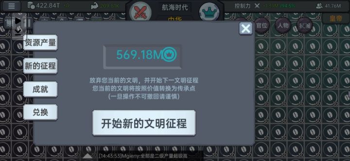 怎么重开?控制力怎么上去?长矛产量怎么到1?如果你有这些疑问的话,可以来看看这张帖哦。(备注:这篇帖子很细腻,如果看不懂,很正常。我还写了一篇高度精简概括版本→)开始重开:传承→新的征程→开始新的文明征程选个图标有两树,两石头,两羊,两马连起来的地图。如下图没有也没关系。只是这种地图更好一些。因为我这赶巧碰到了晚上9点的那波福利,开局多了500k金币。所以我先不换地图,就这个了。跳
