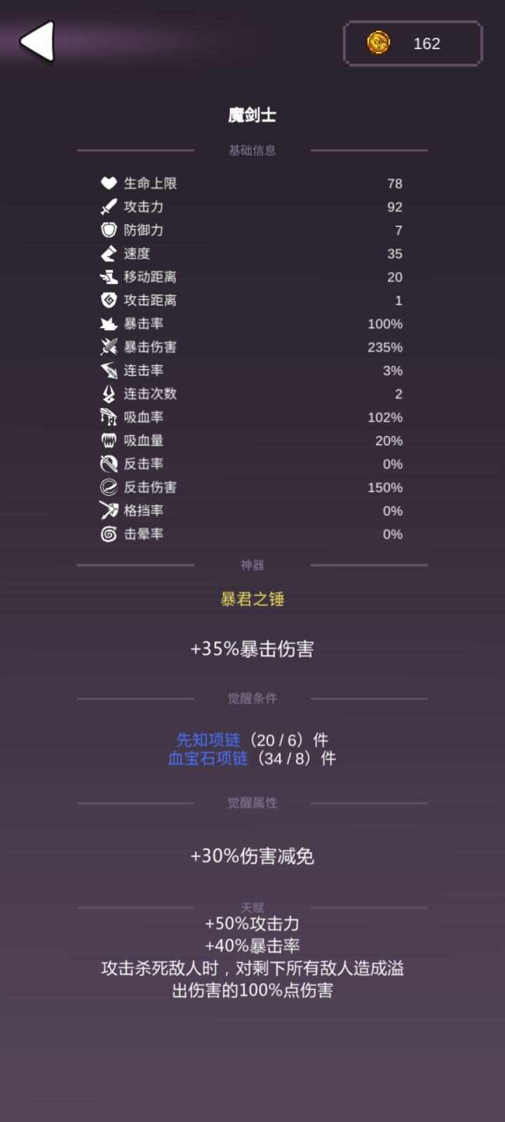本攻略是在本人挨打修女被40%眩晕的BOSS锤死5次以后开发出来的(划掉)正常情况下射手在难度9很难开局,毕竟小怪至少得打4下才能打死(初始8攻,杂役32血,奴隶27血),而且前期速度也很难拉开差距,很容易被几个小怪堵在角落里打死所以我开局选出了圣树盾,觉醒条件是吸血鬼面具5个和火焰宝珠4个,觉醒属性是杀敌对全场造成溢出伤害的一半的伤害,能让后期打的更加舒服下面是开局的一些重点:速度路线1