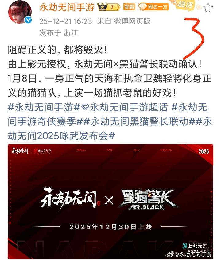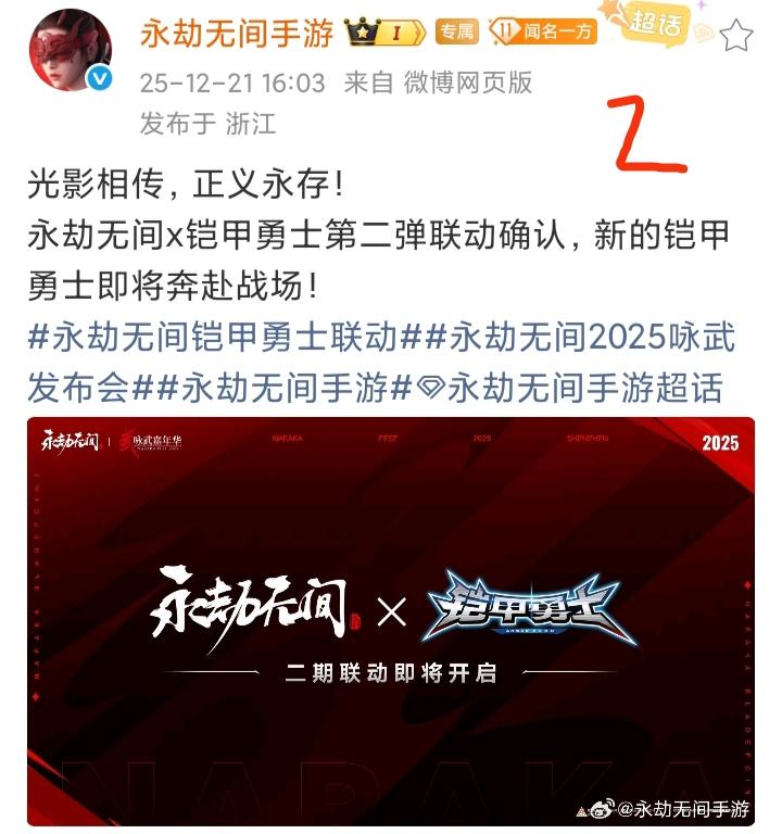 12月21号,《永劫无间手游》发文官宣了包含《守望先锋》、《秦时明月》等在内的5个联动❗❗❗ 与《守望先锋》属于双向联动,2026年新春之际开启!与《秦时明月》的联动,则是明年夏天才出。与《黑猫警长》的联动,将于1月8日上线!与《铠甲勇士》和《洛天依》都是第二弹联动,看看会不会出现什么新鲜玩意儿。在这5个联动中,个人最期待的还是与《守望先锋》的联动!毕竟它之前还有个外号叫守望屁股,应该是